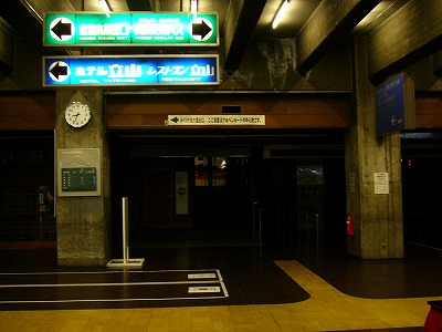 ロープウェイ乗り場の改札口。改札口上の黒地に黄色で示される案内板は室堂のトロリーバスの改札口にも使われていた。