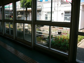1つしかない階段を下りず、その先へ入り込むと、そのあたりは主に喫煙コーナーになっていて、風除けが遠くまで続いている少し殺風景なところだった。ここの風除けは木枠ではなくサッシが入れられている。しかし全体的にクリーム色の色調が支配していて、褪せたクリーム色の鉄骨の骨組みが、いろんなものを知っているようなやさしい色だった。
