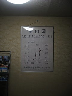 エレベーターを横目に過ぎながら、それが故障のままほったらかしなのに怖さを感じつつも、階段を上って行く女主についていった。とにかく暗い。途中、階の案内図が手書きのものだったので、目を見開いて驚いた。これは凄いところに来たかもしれない。案内図は法律上掲示しなければならないのだろう。しかし作らせるとお金がかかるので、自分で作ったと思われた。よく見ると壁紙も床も、気味悪いほど古いものだった。しかも照明がないに等しいから、一段とその古めかしさは際立っていた。