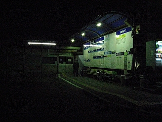 駅舎に近づくころ、稲妻が走った。高速バス乗り場に誰かいる。最悪、バスを待っている人に紛れてあそこで待てるかもしれない。そこに居たのは新しい銀色のジャージを着た老夫婦2人で、これから夜行バスを待つようだった。あらかじめ楽な格好に着替えてしまったようだ。とりあえず駅舎の中を覗きに行ったが、もうさっぱり誰もおらず、駅業務も終了している。寂しいものだ。少しでも長居すると駅員が出てくるだろうと思い、すぐ立ち去った。外に出て、しばらく佇む。もう深夜0時半で、始発まで5時間を切っている。仮にホテルに入ったとしても空しい。気温は 度ぐらい、安全は…とあたりを見回すと、駅舎軒下でこの真冬の夜にタクシーの運転手が、自分の車のドアを開け、その前で何かを枕にして地面に寝そべっているではないか。それを見て、もうなんとでもなるように思えた。待てるだろう。高速バス乗り場のプラスチックの長椅子に腰をおそるおそる据える。やっぱり椅子が冷たい。耐えられず、すぐにちょっと引っ掛ける感じで足も上げてしまう。するとだいぶ暖かだった。老夫婦はさっきから がさがさしていて、荷造りでもしているのかと思ったが、しだいに変だな、と感じはじめた。荷物はちっとも旅行風でないし、それにそもそもこんな時間にバスなんか出るのだろうか。改めて背後の一面時刻表を見ると、最後のバスなんてとっくに出ていて、なあんにもなかった。つまりこの2人は、ここでいつも寝てる人…と、やっと気づいた。それぐらい新しくていいジャージを着ていた。しかも連れ添っているし…。ふっとここにいて大丈夫かなとひらめいたが、向こうのほうが危険を感じているだろうと思い当たり、そっちに関心がないように、なるべく首を駅前側に傾けつづけた。しかし駅舎がどうのこうのお昼に評したくせに、こういう一面を知らなかった。