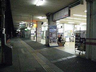 21時半ごろ、無事、新大阪に着いた。列車は遅れなかった。 この駅は多くの人にとって長距離の旅の起点となる駅だろう。 和歌山・紀伊勝浦・新宮方面、福井・金沢・富山方面、名古屋・静岡・東京方面、 岡山・広島・博多方面…。よく見通せる4つのホームにはたくさんの人がいたが、 大阪駅とはちょっと違っていて、大きな土産物袋やキャリーを引いた人がちらほら目に入った。 といってもコンコースに上がるとほとんどすべてがビジネスマンで、 やはり出張からの帰宅途中の人が多い、というのが真相だったようだ。 ところで、ここからがこの旅の大事なところであった。 インターネット界をくまなく探したが、 そのバス乗り場を丁寧に紹介した情報がなかったため、 印刷してきた資料はなく、 地下鉄の北出口を出ればいいということしか、覚えてこなかったのだ。 東出口改札を出ると、左だろうと思い歩き進めた。 なぜなら東に向かって出たなら左が北だから。 歩きながら、方向感覚がわからなくなるなあ、と思いながら階段を降り、 東出口に出た。都会の暗い片隅だった。 出口近くにあるはずのバス乗り場はもちろんない。 やっぱり間違っていたかと思い、階段を上り直し、 上ったところにある案内図をじっくり読んだ。 でもそこにもやはりバス乗り場については一切書かれていない。 しだいにに焦ってきた。このまま見つからなかったら…。 ふと脇を見ると、阪急バス乗りは右と、小さい指示が出ていた。 逆だ、逆を進めばいいんだとわかり、ぐんぐん歩き出した。 さっき出た東出口改札を通り過ぎた。 それからはとにかく店が多かった。途中通りかかったたこ焼き店の前では、 従業員がタンボール箱をつぶしていた。店の前でするかな、と思っていたが、 よく考えるともう夜10時で、あと1時間もすればこの新幹線駅もほぼ眠りに就くのだった。 店の立ち並ぶ通路の雑踏の、速い流れに身を任せながらも、 常に遠くの案内表示に目を凝らしていた。先読みをする。 この日は利用者数調査をしていたらしく、 腕章をした私服の人があちこちにパイプ椅子に座って、カウンタをかたかた押していた。 こんなときに迷ってうろうろしたら、彼らがいらいらしそうだ。さらに心が逼迫した。