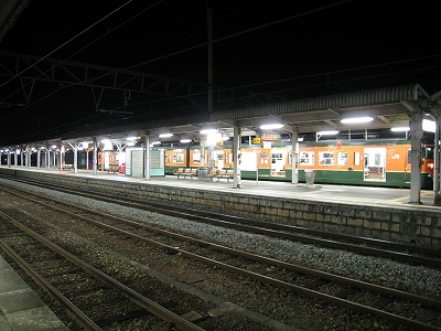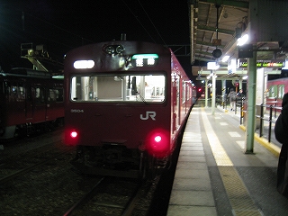 寺前で乗り換えるとき、一人、列車を撮ってはすぐ手元を隠し知らんふりしてタバコを吸うのを繰り返す、ジャンパーを羽織った四十前くらいの人がいた。そんな、思春期であるまいし。あと、フラッシュ焚かないようにすれば少しはましになるのではと心の中で提案。いろんな人が乗っていたんだな。夜も深いこんな本線の外れの駅ながら、乗り換え客はけっこう居て、寒風入る改札口では列車到着に合わせ、出るものは居らぬかと、神戸支社の駅員がありがとうございましたと声を出しながらきっちり立っていた。