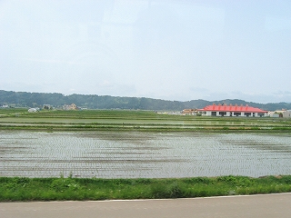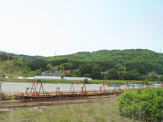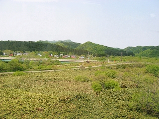 津軽線の車窓。山側。 北国はこの時期になってようやく田植えが終わったというところ。
