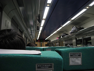 有人改札を横目で過ぎて別のホームへの階段を降り、ドアまで小走りに寄って、列車に乗り込む。間に合った。乗客が数人いた、スチール枠に囲われた化学的な濃青色のモケットが車内を暗くしていた。いつ動き出してもおかしくない感じだ。ともかく、音もたてないようにして、椅子に腰かける。青のモケットは座り込みが深かった。