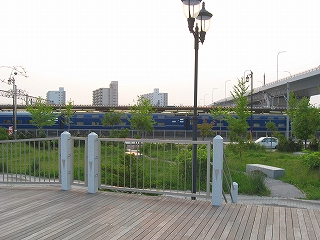 駅構内を軽々と跨ぐ。向こう側の港にはクルーザーが多く休暇的。