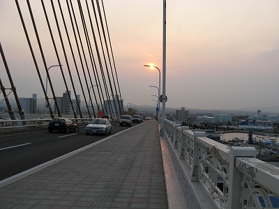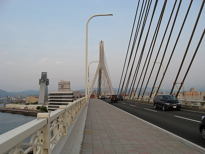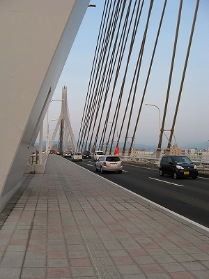 青森ベイブリッジに上ってみよう。この通路は朝7時から夜9時までしか通れないという。