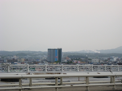 十二岳、大倉岳、袴腰岳などらしき市境の600m級の山々が右手に霞んで見える。