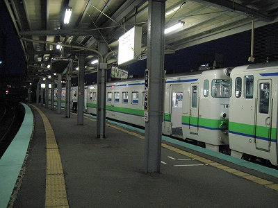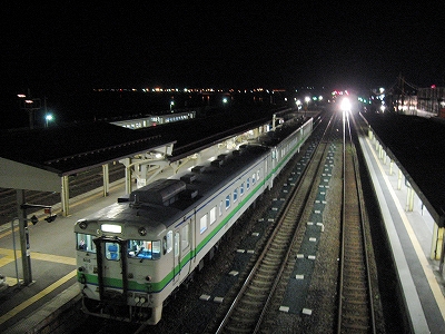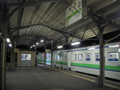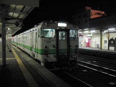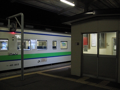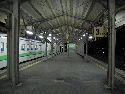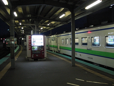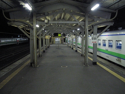 さて、ここから先は参ったなと思った。とりあえず明日は長万部の前後をメインにしたいから、この森―長万部の区間の長万部寄りでどこか寝られる駅を探さないといけない。予定が変わったので下調べは何もしていない。ともかく長万部行きに乗り込むが、このときはなんだか怖かった。客は誰もいないし、時刻は20時半。こんな時刻に幽霊さまよいそうな長万部に向かう人などいないのだ。宿も開いてない