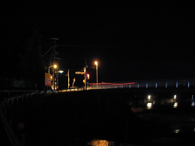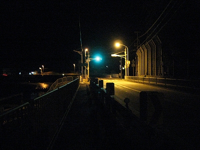 ほとんど止まらず、すぐ手前に分岐があれ、右の方が広かったのでそこを折れた。しかし本道いう感じでもなかった。走りながら、まあとにかく海に近づいているんだから道は単純だろうと、走っていくと川に出会い、気づくと、黒い水面にさめざめと国道の信号の映る川に、見上げる橋がかかっている、そういうところに出た。「これか。この川は海に注いでるんだな。」 微かに波音と潮風。けれど国道には出られない。「てことは、あの狭隘な道が本道なのか。うそだろ。」 幸いすぐ近くに人道用の橋があった。