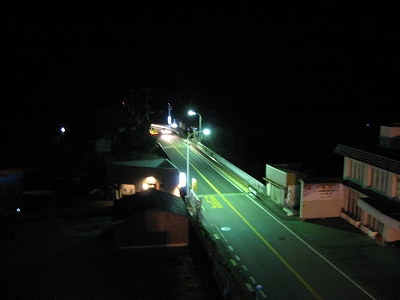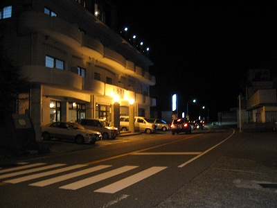 冷たい空気で胸が痛む。白い数階建ての横長なホテル。玄関口にしらさぎの名があるのを見て、遠いわあ、と漏らす。実は地図上では1.8kmしかない。だから私も予定の段階で行けると思った。おまけに自転車ならなおさら。しかし山から海、そしてアップダウン、また紀伊半島独特の山の深さ、夜の海のせいで、けっこうこたえてしまった。無事着いたけど、帰りのことを考えると、うわあと憂鬱になる。  「でもまあ、せっかく着いたんだし、うんとゆっくりしてやろうよ。いっぱいあったまったら、まあ少しは気持ちも変わるかも。」  そんなわけないと言う自分をうやむやにして、フロントに入った。  前に車は結構駐まってた。はやってるんやなあ。それや車だったら何の不安もないよな。