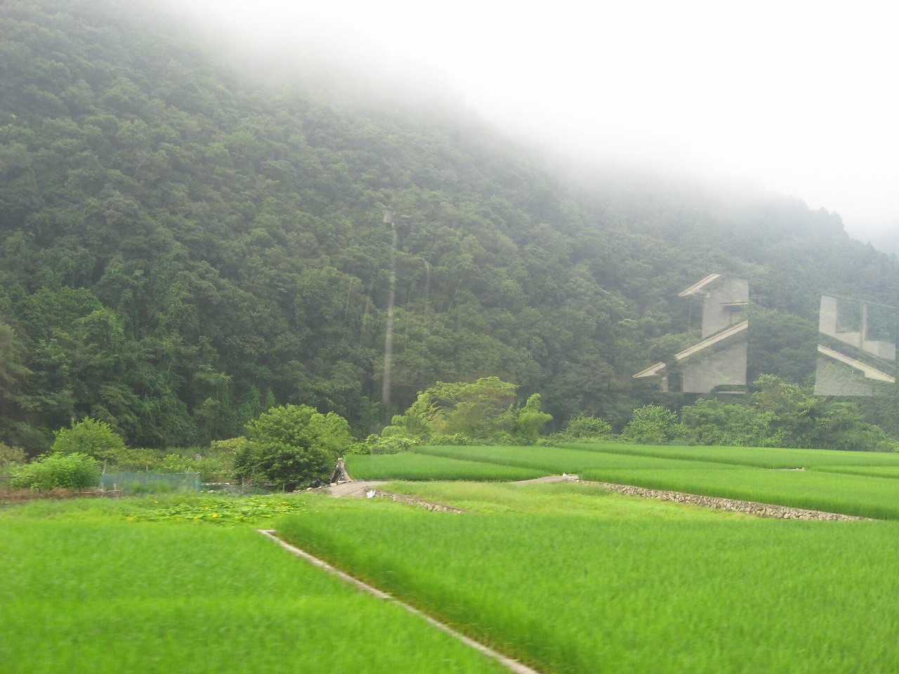 朝の夏は何か緊張を催させるところがある。じんわり広がりはじめる青空と早くから高い日差しに比して冷涼な空気…旅の緊張 ― そう、旅は独りでなくてはならない。貴殿がいつかは独りになるように ― 僕はいつも独りになる訓練をしているような気がした。しかしそれは、人とかかわりを持たない、自分との深く延々たる対話だ。僕の身体は平行モケットでトランポリンのように揺らされ、まぶしい緑の水田や、人家の群れを、いっぱいの金粉を浴びせながら車窓が魅せる。その金の油の飛沫の調理でなせる料理を、僕は風景としてむさぼっていることに気が付いた。だからろくろく食事もいつも摂らないんだ。
