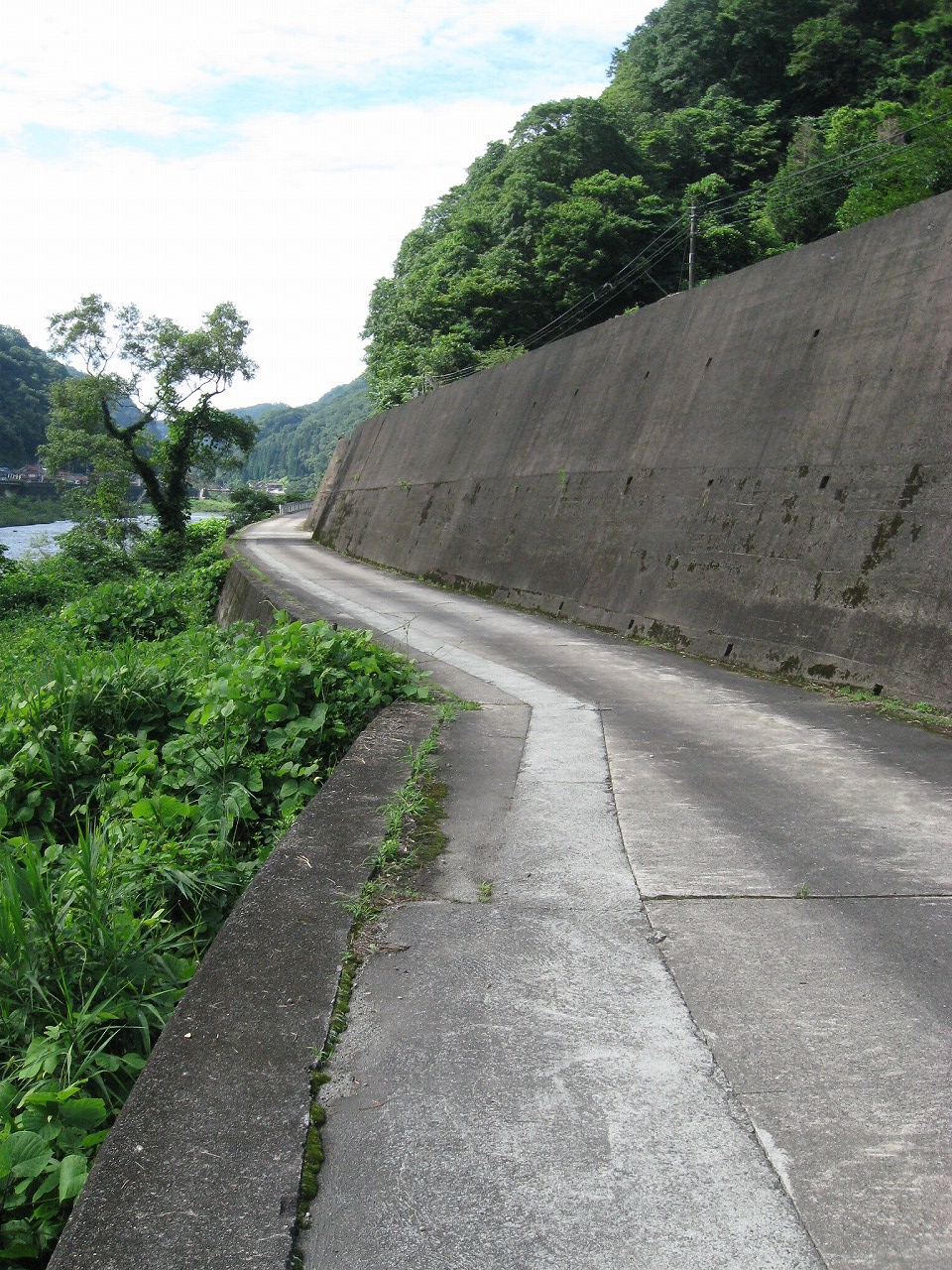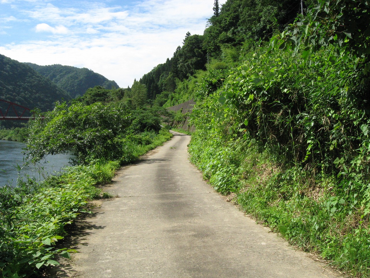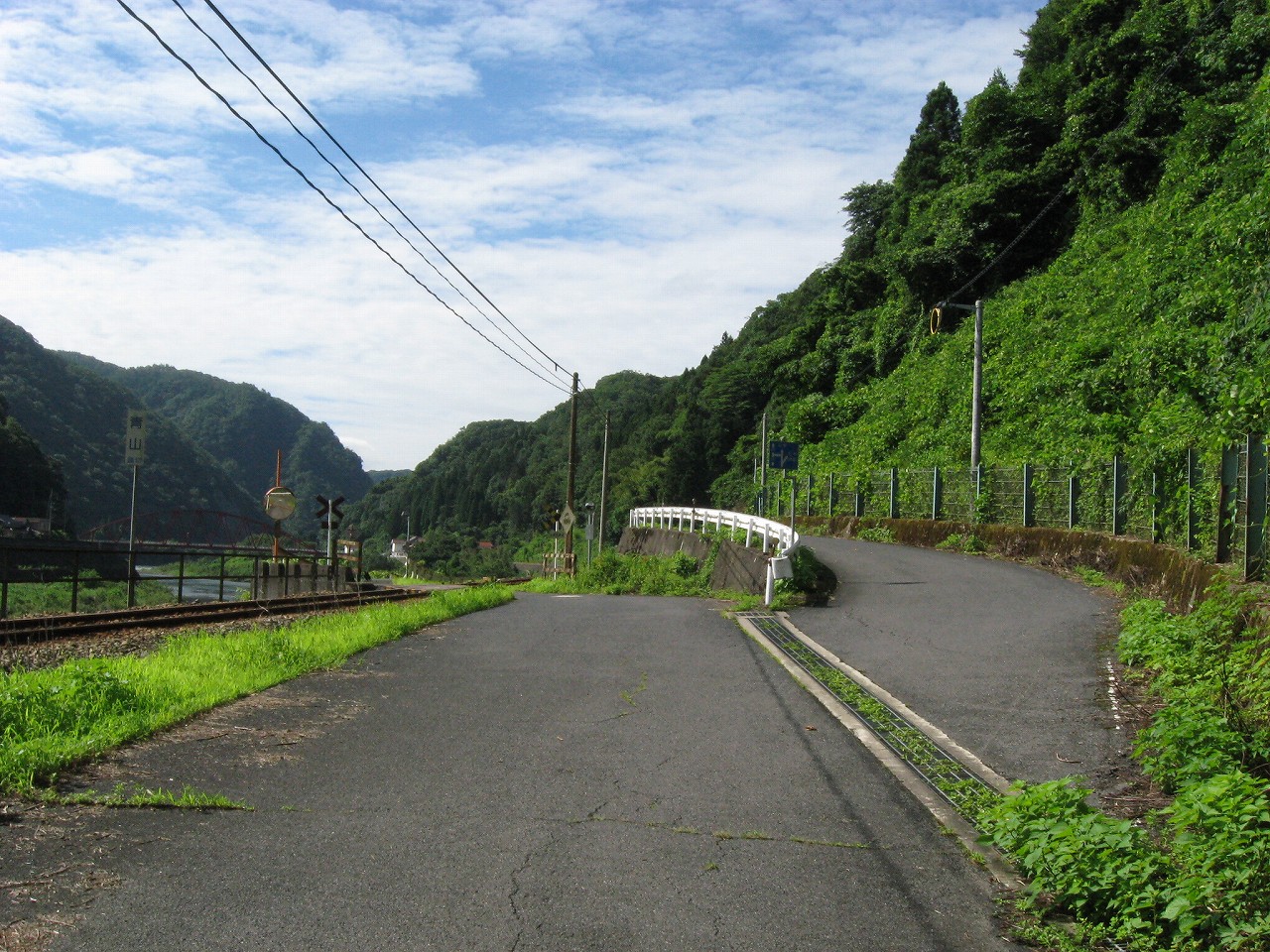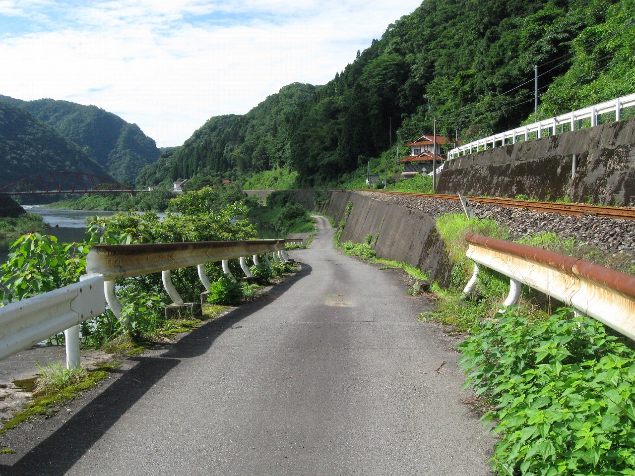 それにしても、歩きながらすぐ脇の三江線を観察するに、小谷を跨ぐのはコンクリート橋ばかりで鉄橋ではない。三江線がだいぶ下った時代に造られたこどかよくわかる。でも静かだからこっちの方がいいだろう。 道はひと気もなくなり、草がボウボウのコンクリート舗装の河岸道だ。こんなに明るい夏なのに、歩いていて何とも心細くなってくる。ときおり蝉の鳴き声が遠くなっていく気がする。けれど駅があるのを信じてひたすら歩く。さぁもうそろそろ橋だぞ、というころになると、レールは道と同じ位置にあり、アスファルトになって広くなっていた。けれど駅はないし、町もない。けれどかかった時間からすると、この辺としか考えられなかった。