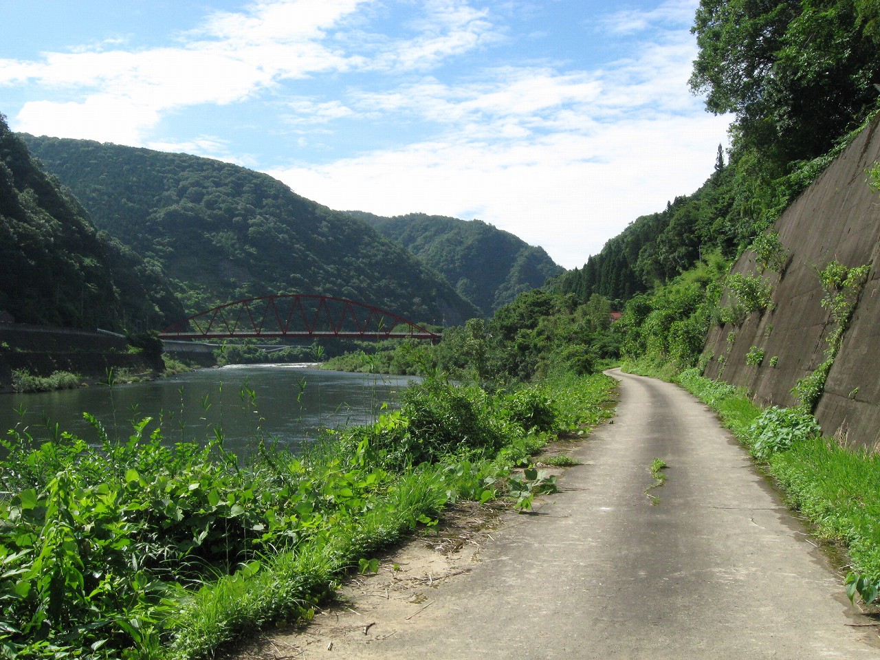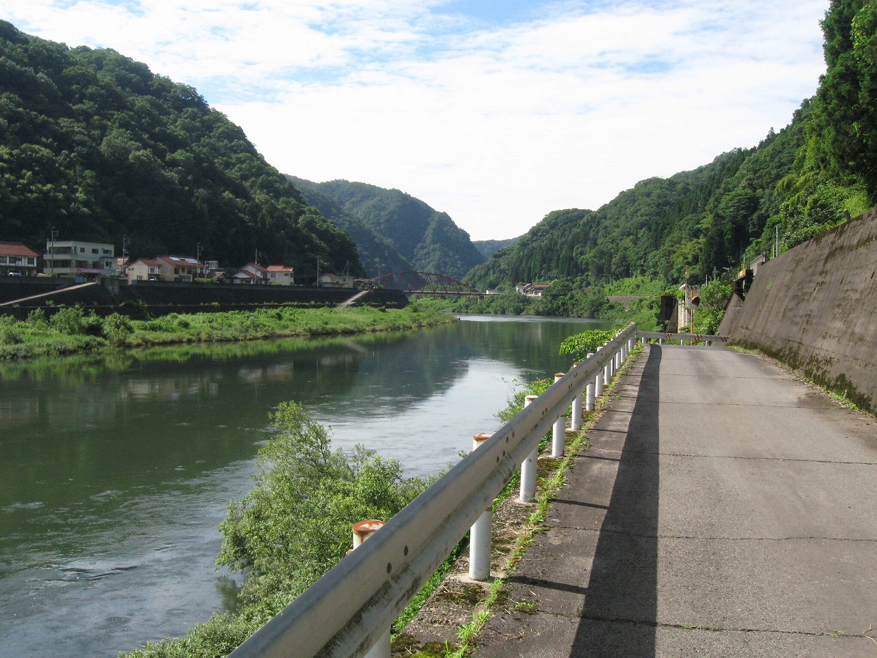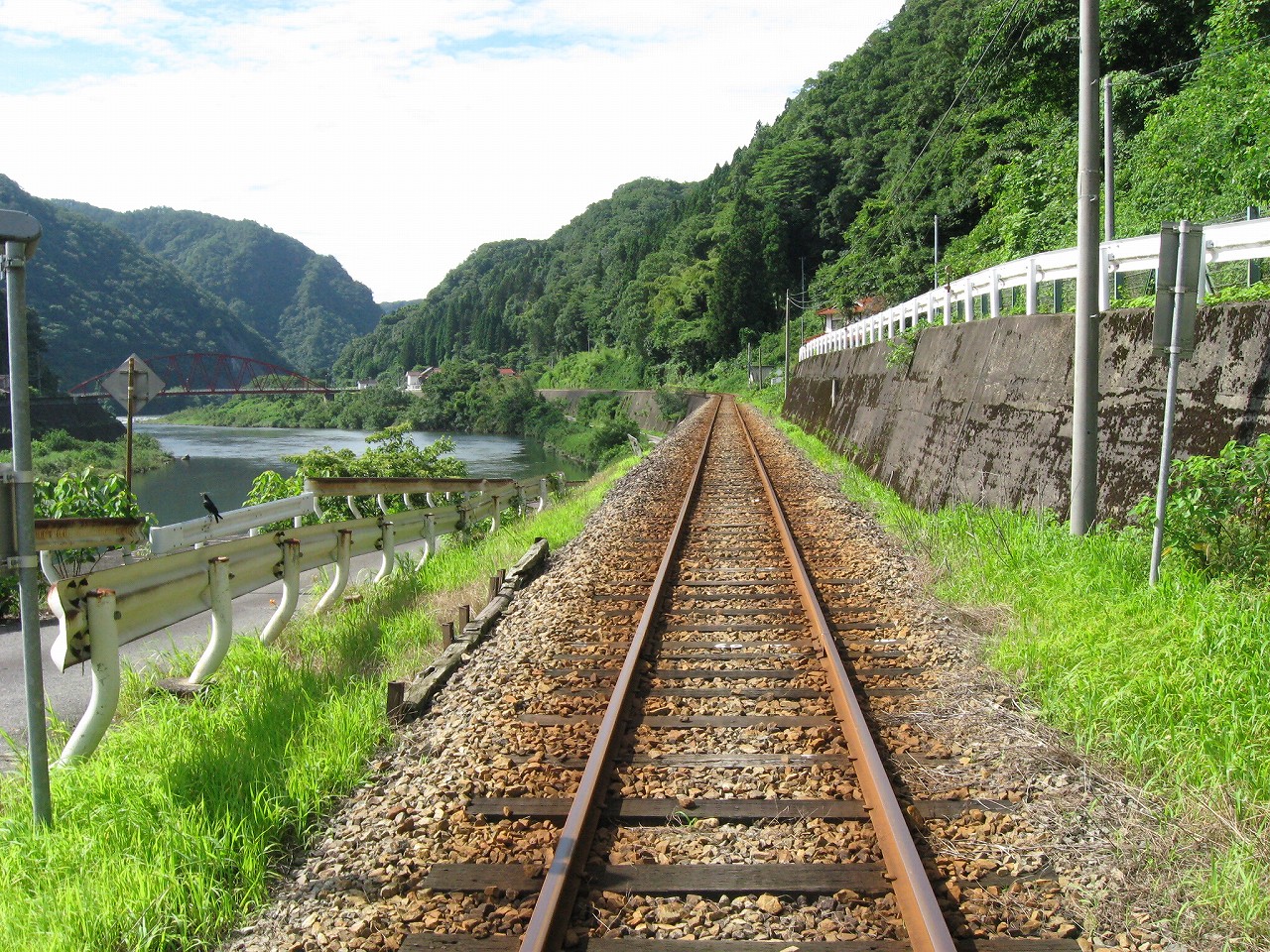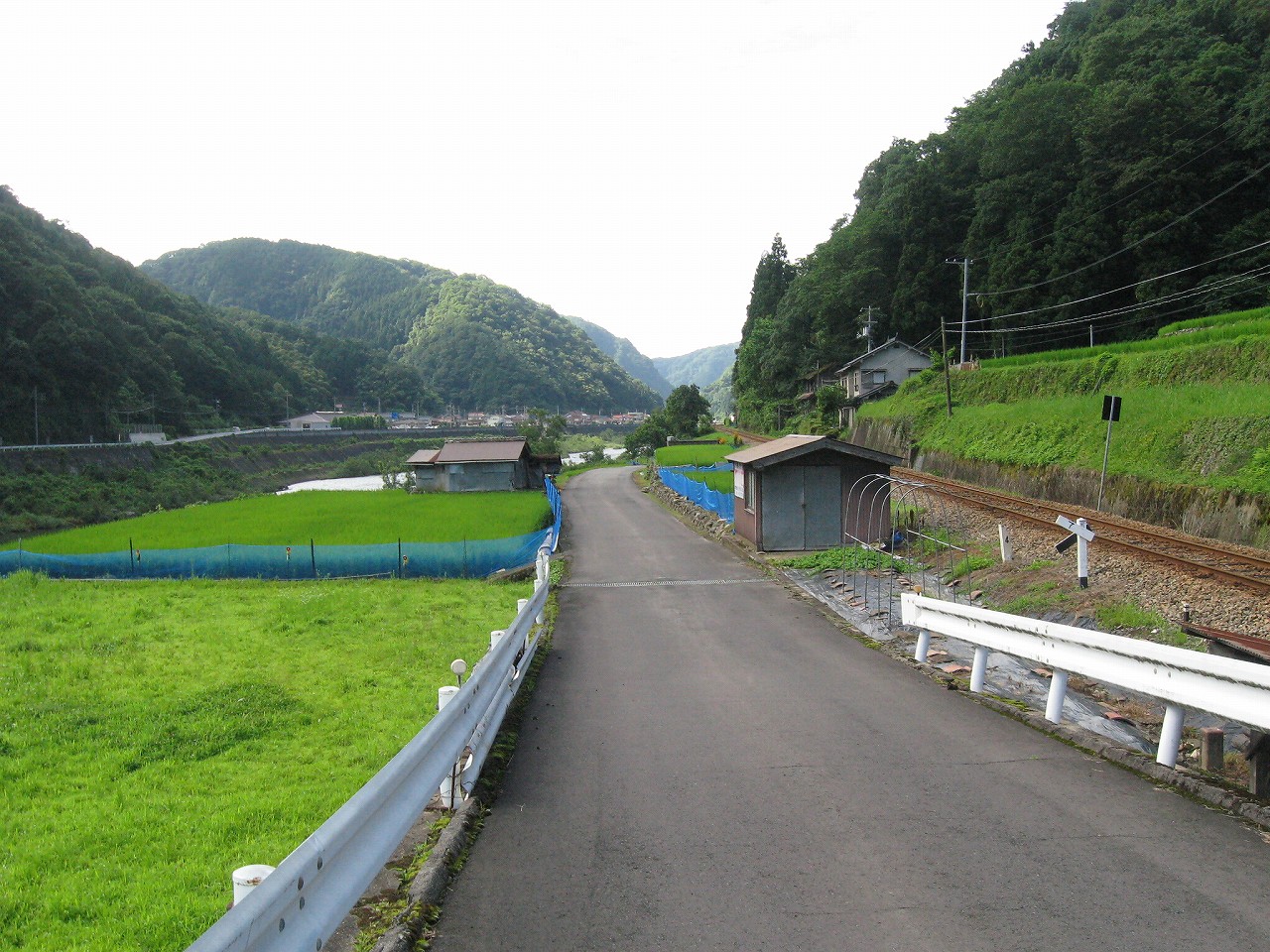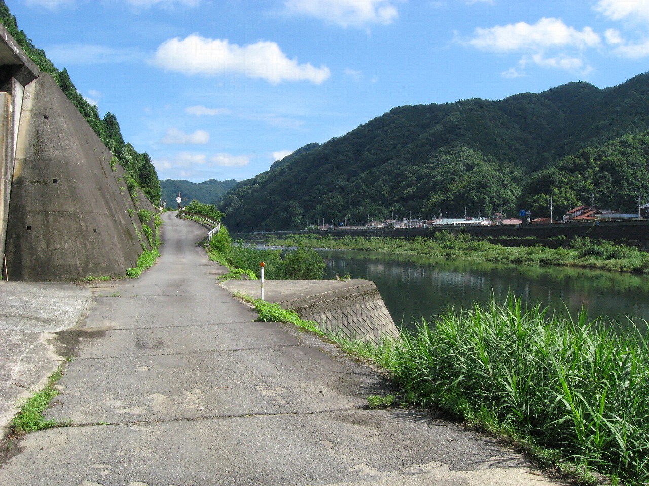 それにしても、歩きながらすぐ脇の三江線を観察するに、小谷を跨ぐのはコンクリート橋ばかりで鉄橋ではない。三江線がだいぶ下った時代に造られたこどかよくわかる。でも静かだからこっちの方がいいだろう。 道はひと気もなくなり、草がボウボウのコンクリート舗装の河岸道だ。こんなに明るい夏なのに、歩いていて何とも心細くなってくる。ときおり蝉の鳴き声が遠くなっていく気がする。けれど駅があるのを信じてひたすら歩く。さぁもうそろそろ橋だぞ、というころになると、レールは道と同じ位置にあり、アスファルトになって広くなっていた。けれど駅はないし、町もない。けれどかかった時間からすると、この辺としか考えられなかった。