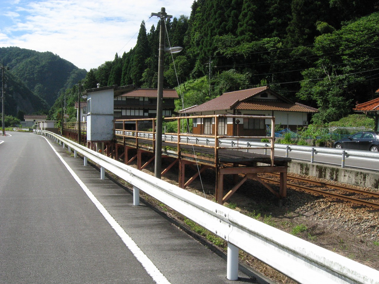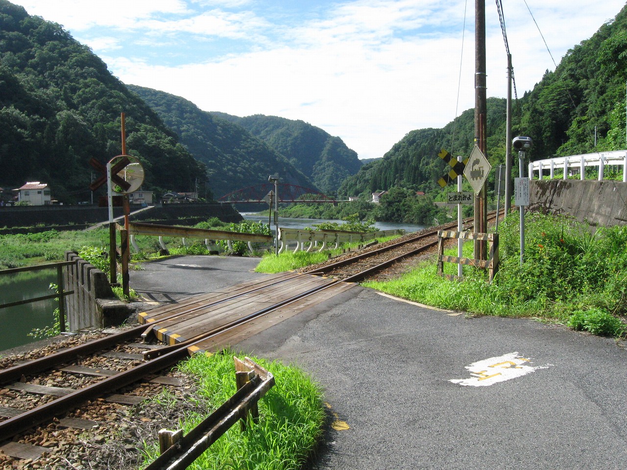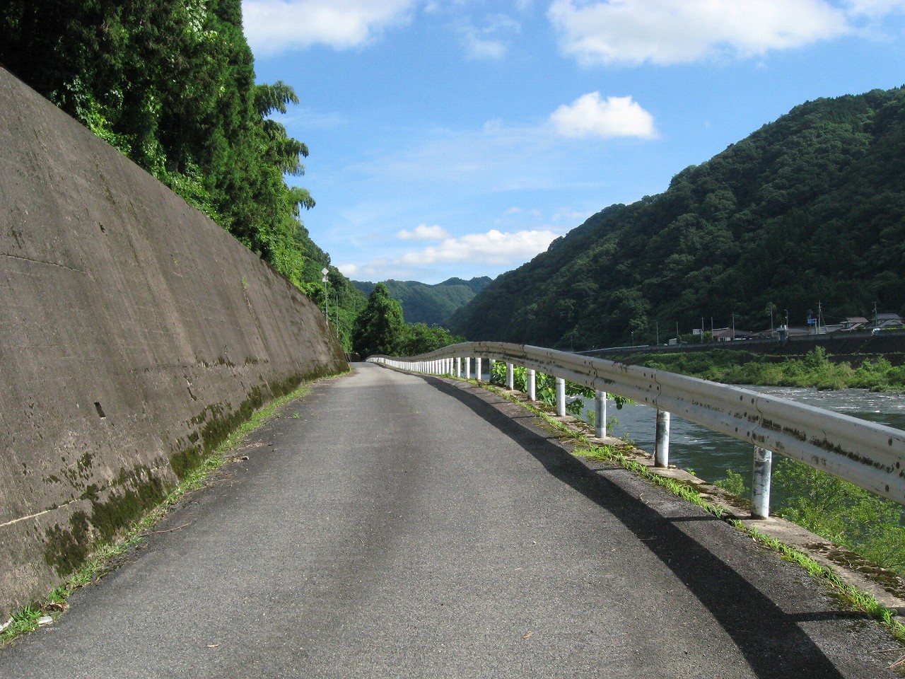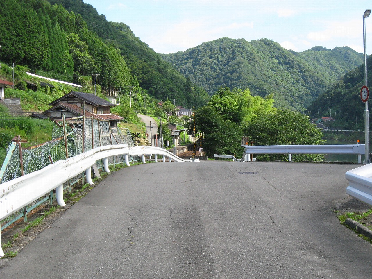 それにしても、歩きながらすぐ脇の三江線を観察するに、小谷を跨ぐのはコンクリート橋ばかりで鉄橋ではない。三江線がだいぶ下った時代に造られたこどかよくわかる。でも静かだからこっちの方がいいだろう。 道はひと気もなくなり、草がボウボウのコンクリート舗装の河岸道だ。こんなに明るい夏なのに、歩いていて何とも心細くなってくる。ときおり蝉の鳴き声が遠くなっていく気がする。けれど駅があるのを信じてひたすら歩く。さぁもうそろそろ橋だぞ、というころになると、レールは道と同じ位置にあり、アスファルトになって広くなっていた。けれど駅はないし、町もない。けれどかかった時間からすると、この辺としか考えられなかった。