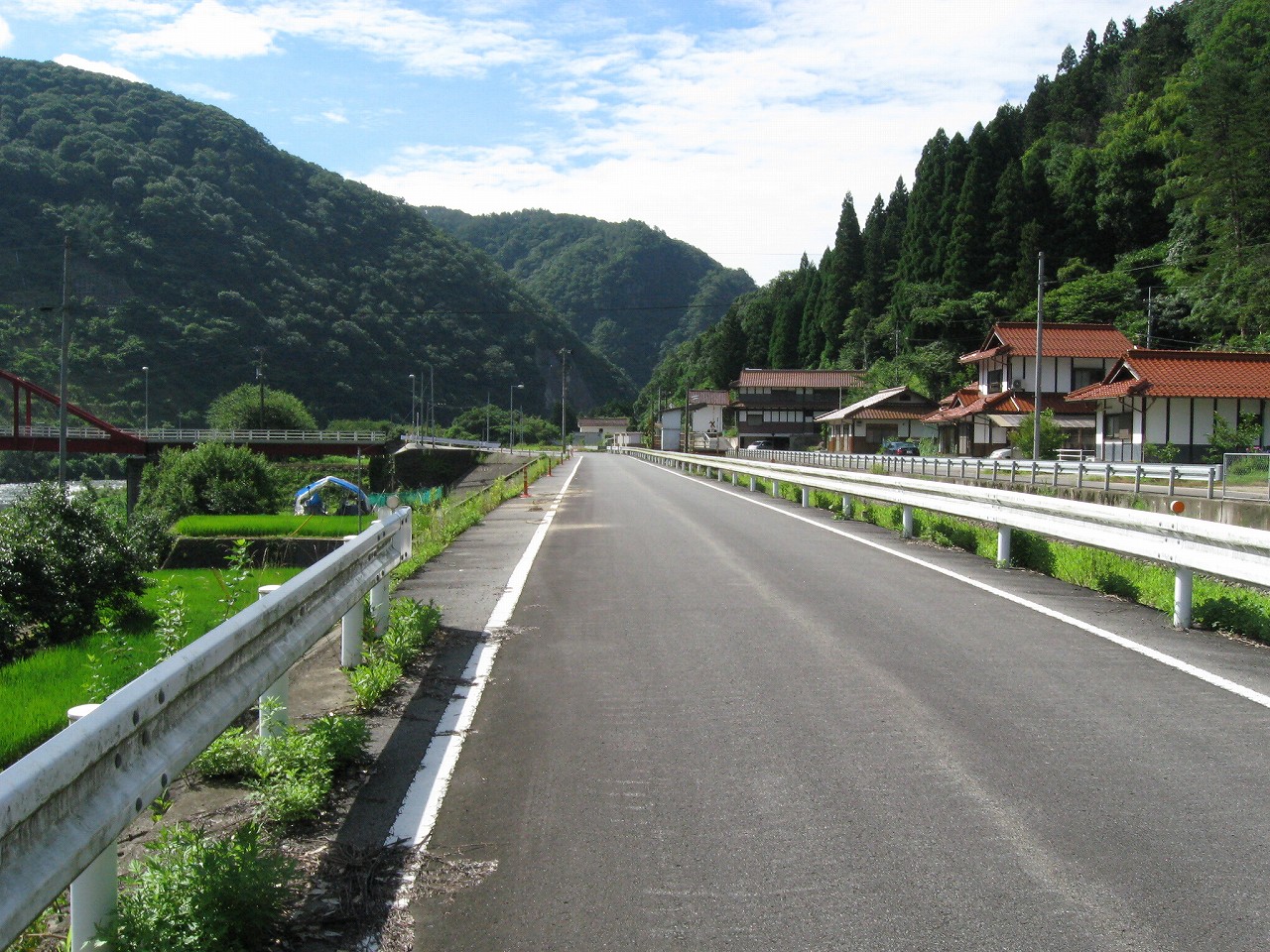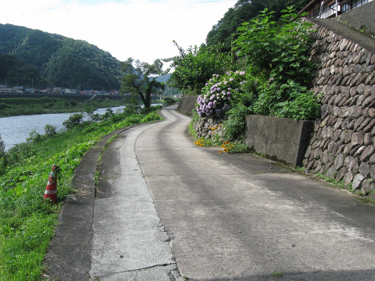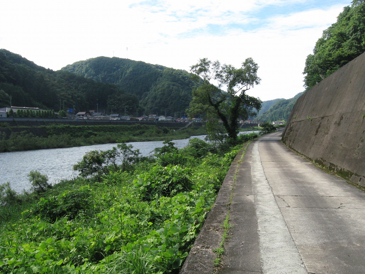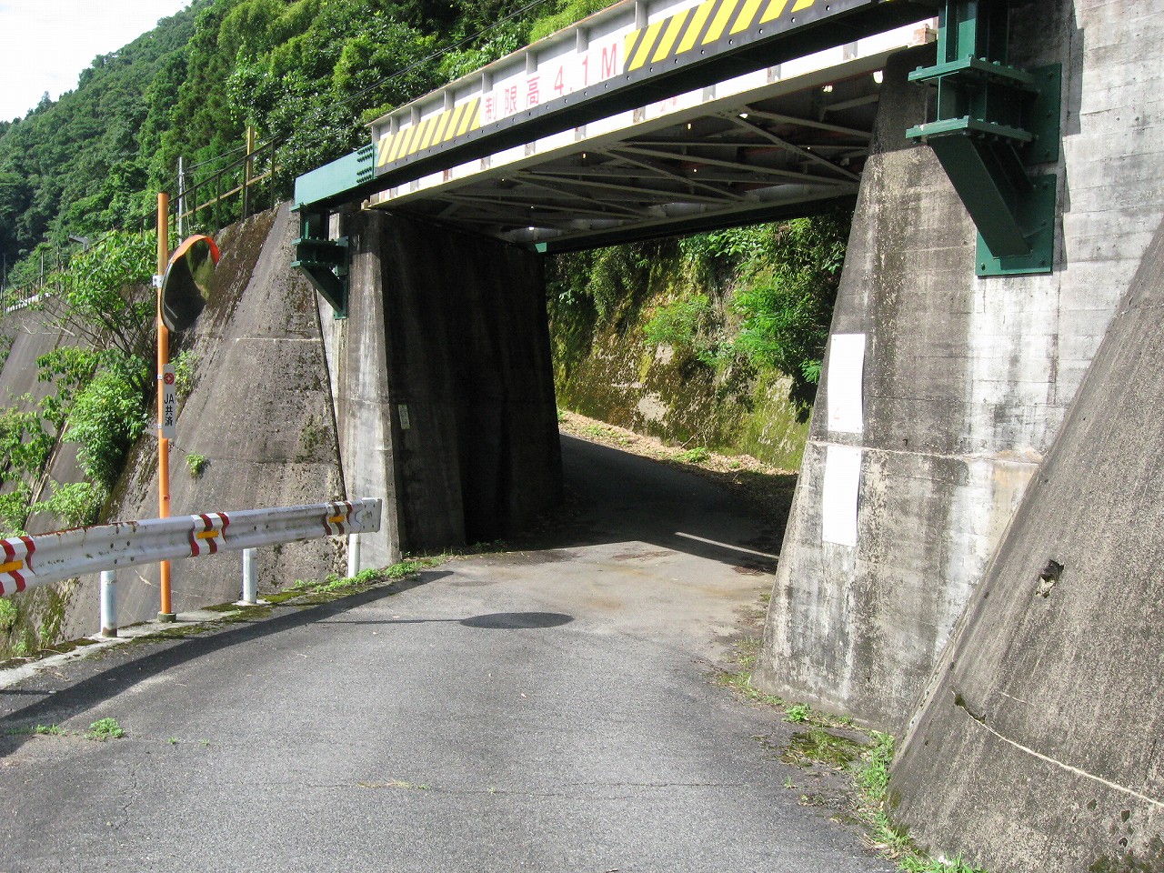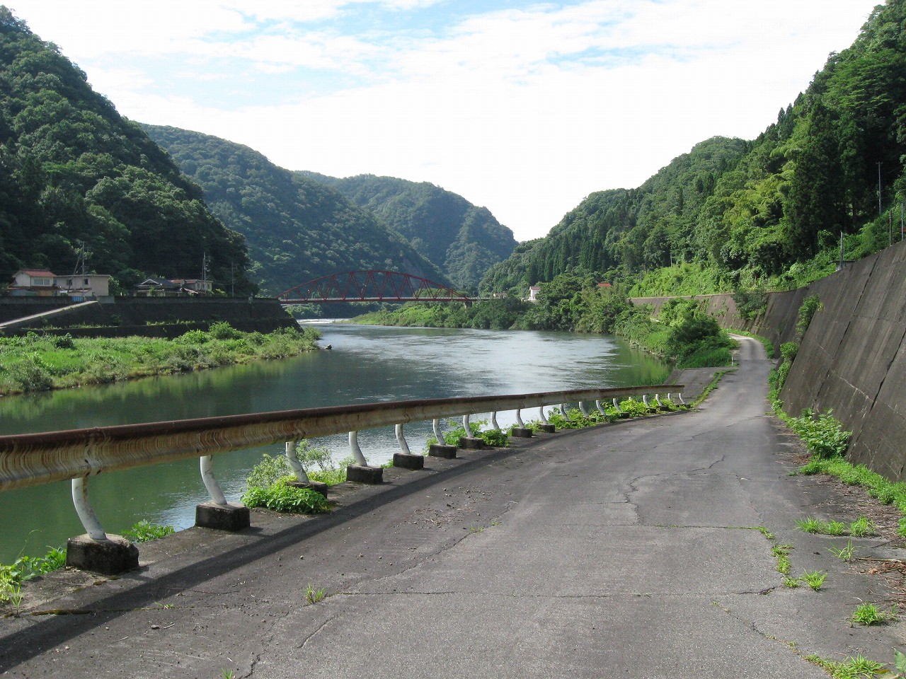 それにしても、歩きながらすぐ脇の三江線を観察するに、小谷を跨ぐのはコンクリート橋ばかりで鉄橋ではない。三江線がだいぶ下った時代に造られたこどかよくわかる。でも静かだからこっちの方がいいだろう。 道はひと気もなくなり、草がボウボウのコンクリート舗装の河岸道だ。こんなに明るい夏なのに、歩いていて何とも心細くなってくる。ときおり蝉の鳴き声が遠くなっていく気がする。けれど駅があるのを信じてひたすら歩く。さぁもうそろそろ橋だぞ、というころになると、レールは道と同じ位置にあり、アスファルトになって広くなっていた。けれど駅はないし、町もない。けれどかかった時間からすると、この辺としか考えられなかった。