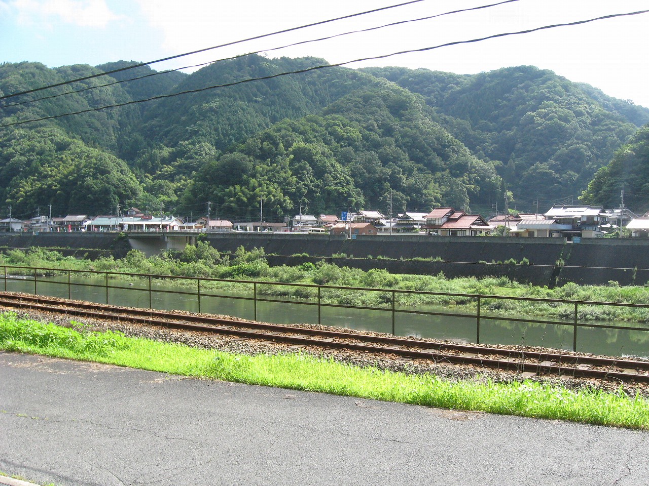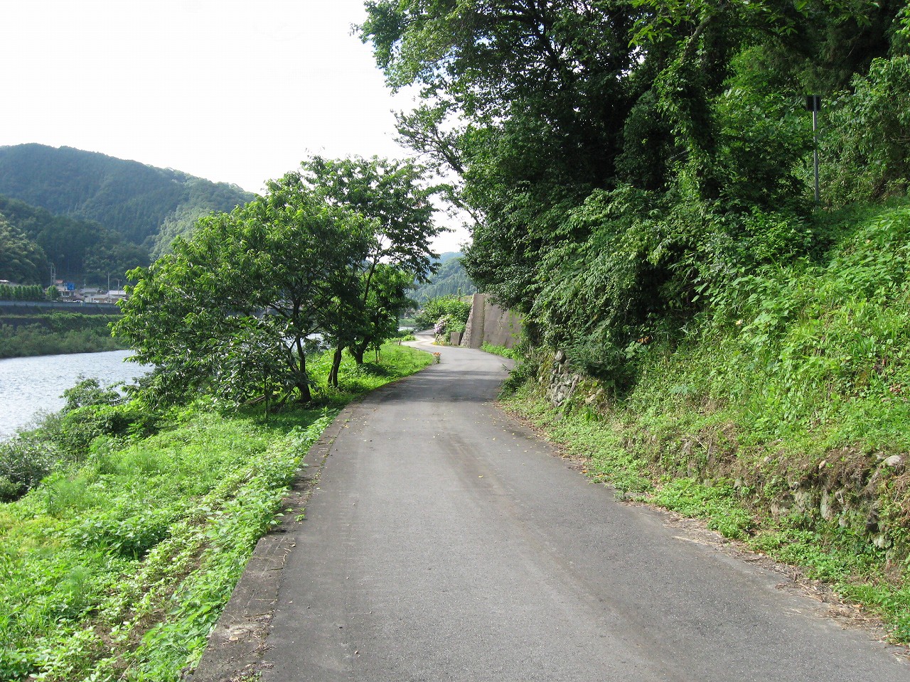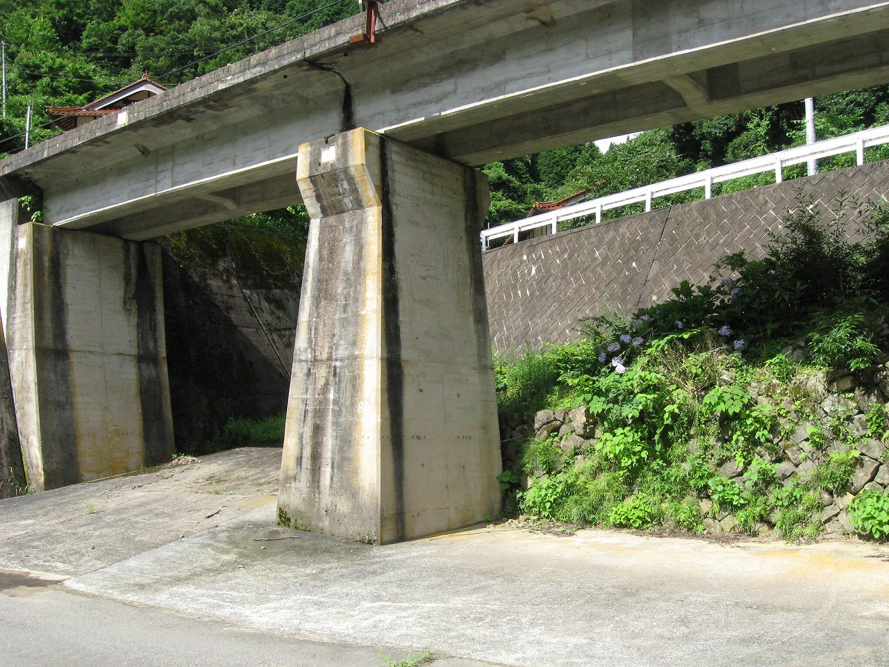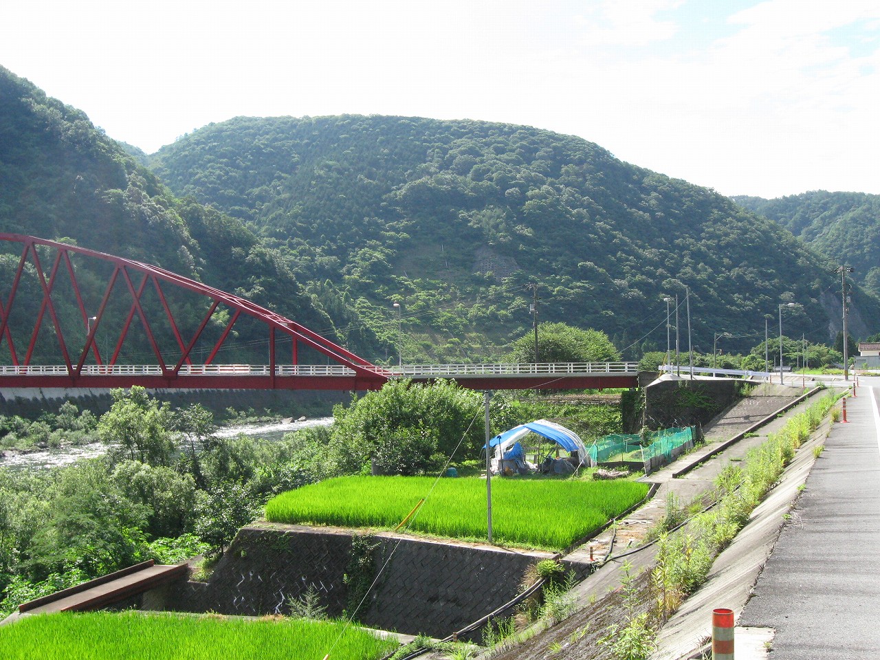 それにしても、歩きながらすぐ脇の三江線を観察するに、小谷を跨ぐのはコンクリート橋ばかりで鉄橋ではない。三江線がだいぶ下った時代に造られたこどかよくわかる。でも静かだからこっちの方がいいだろう。 道はひと気もなくなり、草がボウボウのコンクリート舗装の河岸道だ。こんなに明るい夏なのに、歩いていて何とも心細くなってくる。ときおり蝉の鳴き声が遠くなっていく気がする。けれど駅があるのを信じてひたすら歩く。さぁもうそろそろ橋だぞ、というころになると、レールは道と同じ位置にあり、アスファルトになって広くなっていた。けれど駅はないし、町もない。けれどかかった時間からすると、この辺としか考えられなかった。