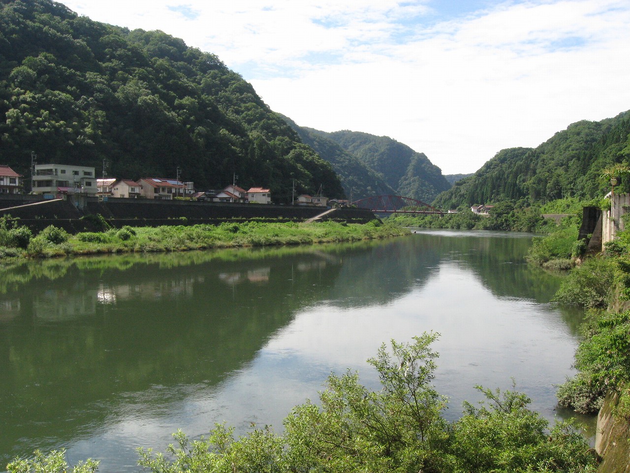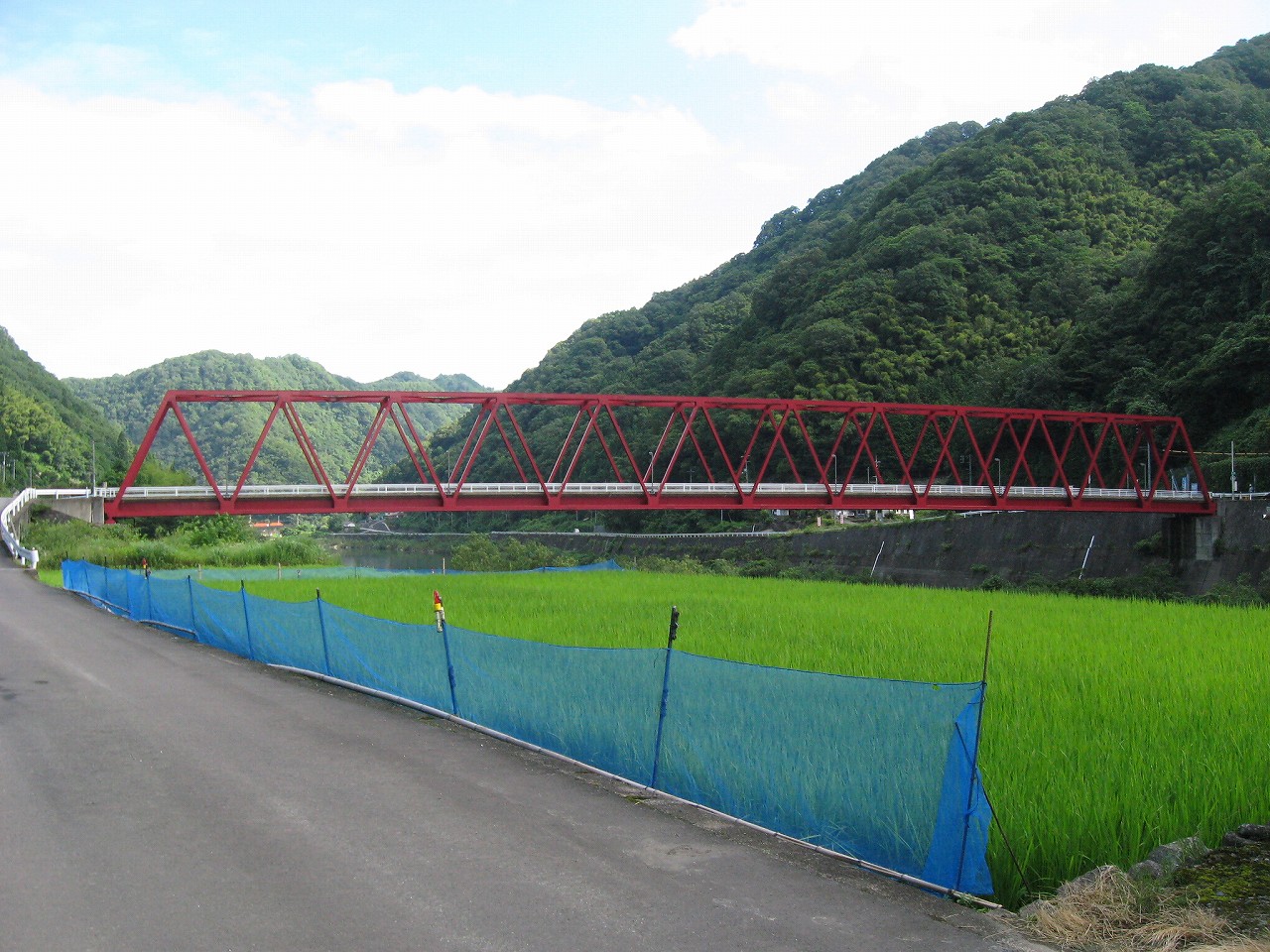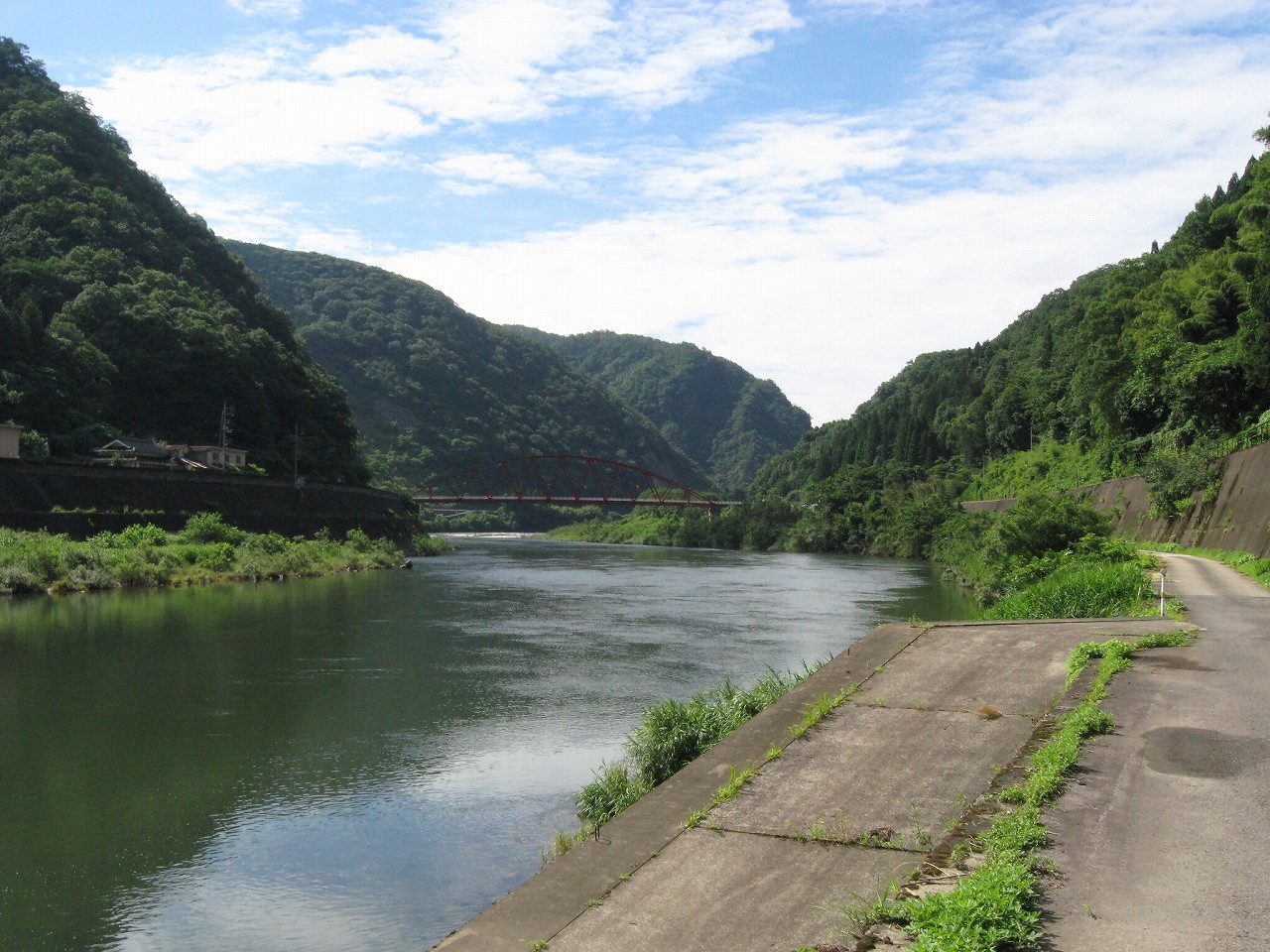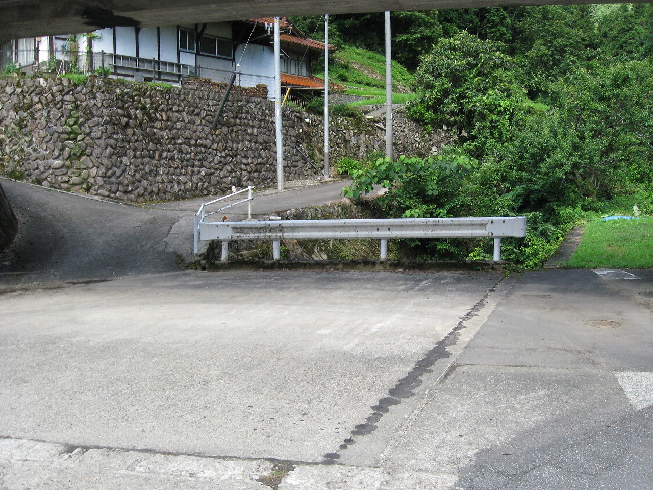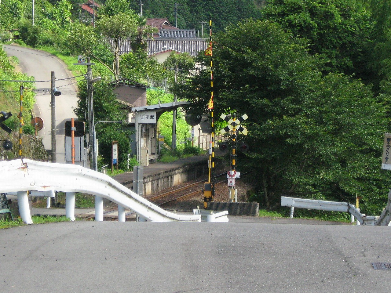 それにしても、歩きながらすぐ脇の三江線を観察するに、小谷を跨ぐのはコンクリート橋ばかりで鉄橋ではない。三江線がだいぶ下った時代に造られたこどかよくわかる。でも静かだからこっちの方がいいだろう。 道はひと気もなくなり、草がボウボウのコンクリート舗装の河岸道だ。こんなに明るい夏なのに、歩いていて何とも心細くなってくる。ときおり蝉の鳴き声が遠くなっていく気がする。けれど駅があるのを信じてひたすら歩く。さぁもうそろそろ橋だぞ、というころになると、レールは道と同じ位置にあり、アスファルトになって広くなっていた。けれど駅はないし、町もない。けれどかかった時間からすると、この辺としか考えられなかった。