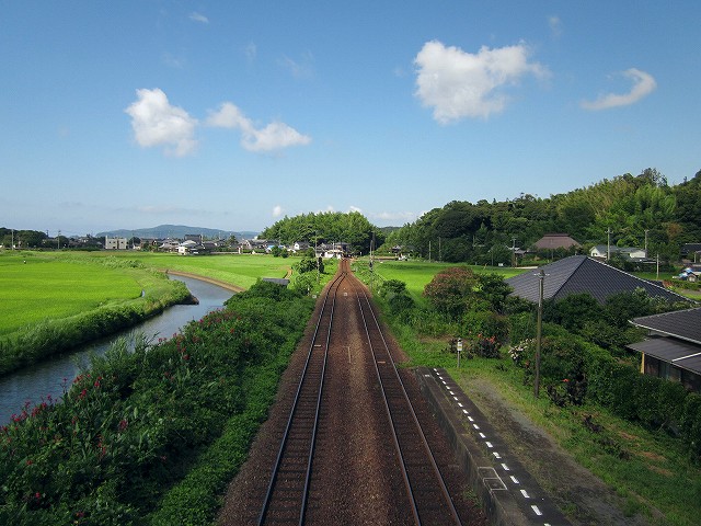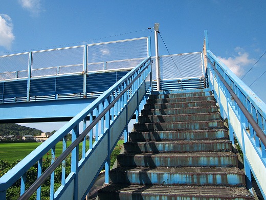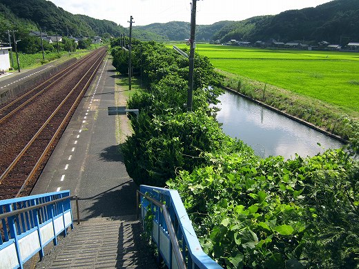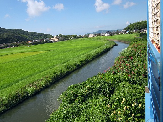 私はどうしてもどうやって曲がったのかを知りたく、跨線橋に昇ってやって来た方向を望みました。すると、氾濫原のような、緑の草草に囲まれた川がゆるゆると流れていて、なにかもっともっと昔の世界に帰った気がしました。