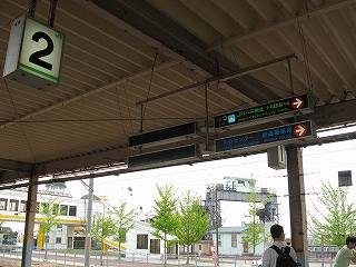 構内をまたぐ陸橋。あまり使われない規制標識が二つ。