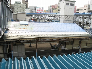 トタンをレンガ調に並べた屋根。左端に当跨線橋、右端に手荷物用跨線橋、と並行して架かっている。
