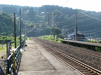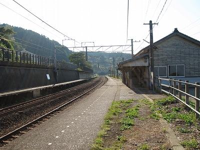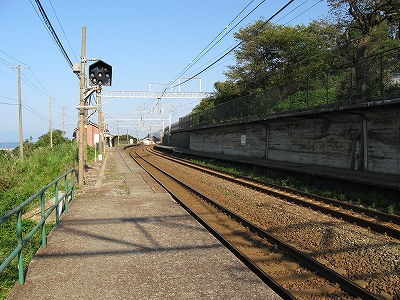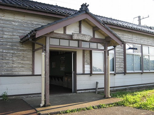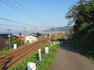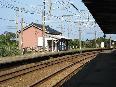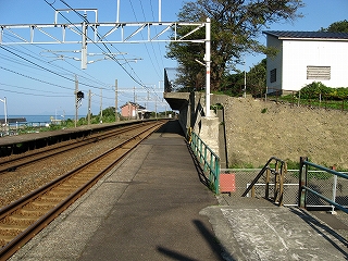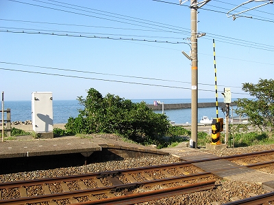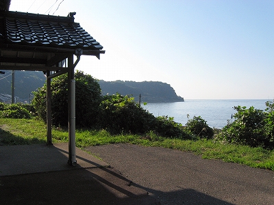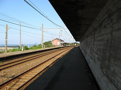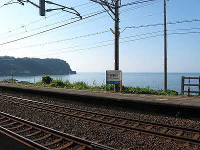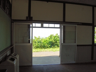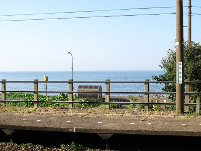 駅舎からまた懲りずに表へ出た。さわさわ緑茂るここ高台の向こうに、海が覗いている。駅舎の入口はどういうわけか、客の方を見ず、真っ向海ばかり見ている。
