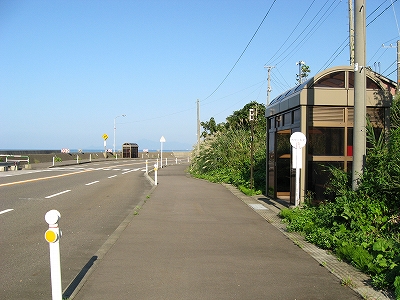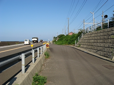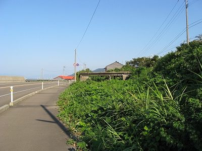 国道8号に出た。この辺もまた、国道とはいえども店の賑わいなどはなく、ホームから俯瞰したようにL字の漁港しかないところで、旅人を楽しく困らせる駅である。けれどもちょっとため息が出た。「はあ…」。果ての沿岸部かのように、車が国道を走り抜いている。ついに有間川にも自分は来たんだな。車にとって、道中の些細な一景にすぎないものが、目の前に厳然と固定され、自分は車たちとは、こうして見る分には、違う速度で、ひいては、違うやり方、考え方で、進んでいくようであらねばならないんだ、と思わされた。この暑さを背負って、延々沿岸部を歩く、そういう自分が想像された。そういうはてしない想いだけの残るところが、駅から出て訪れまた駅に踵を返す、駅の旅のだと思われた。