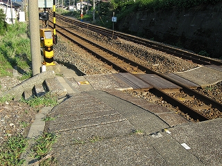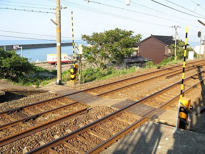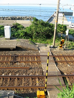 流木渡ししごき構内踏切。とても小さい。私の線路横断を海浜性の大きな葉の植物が彩る。