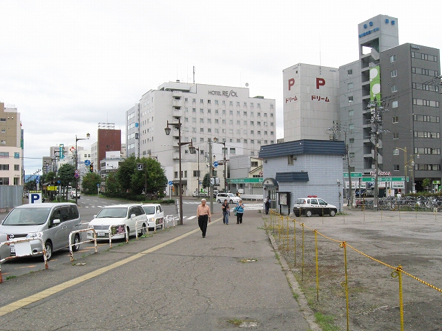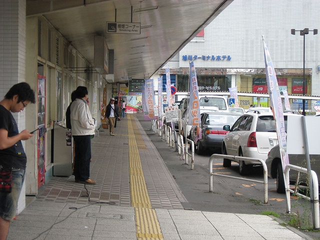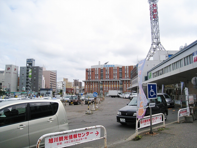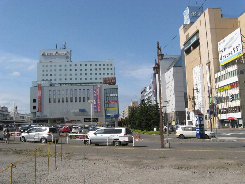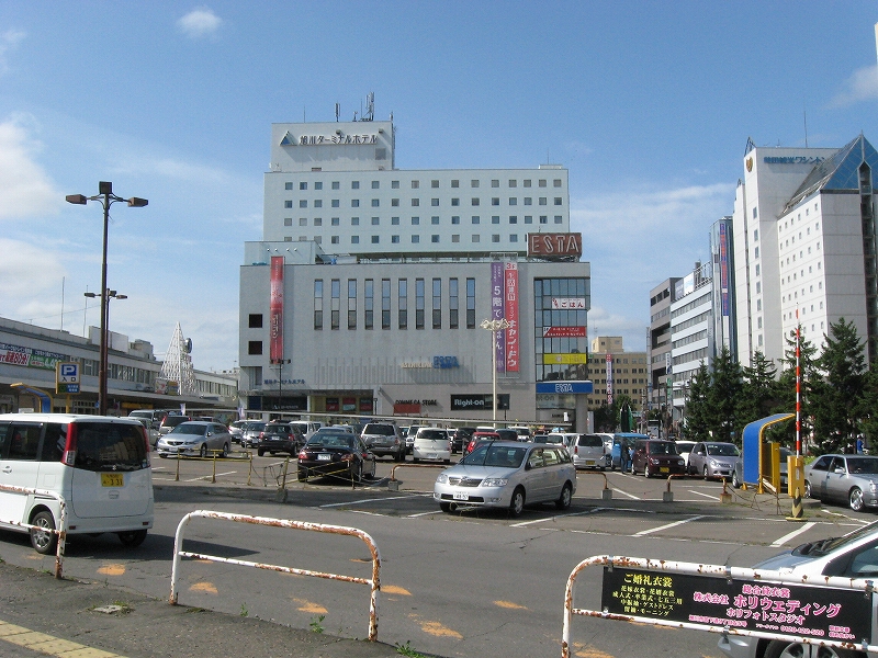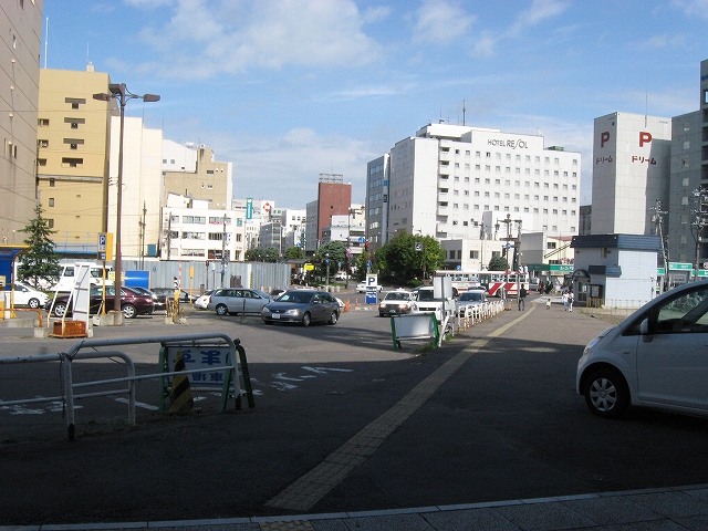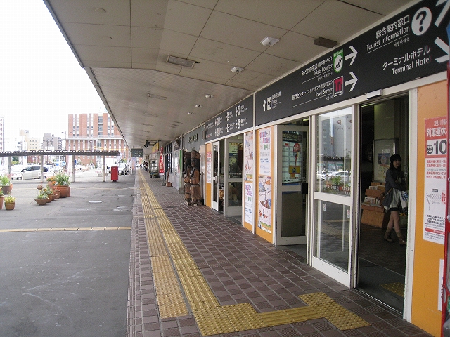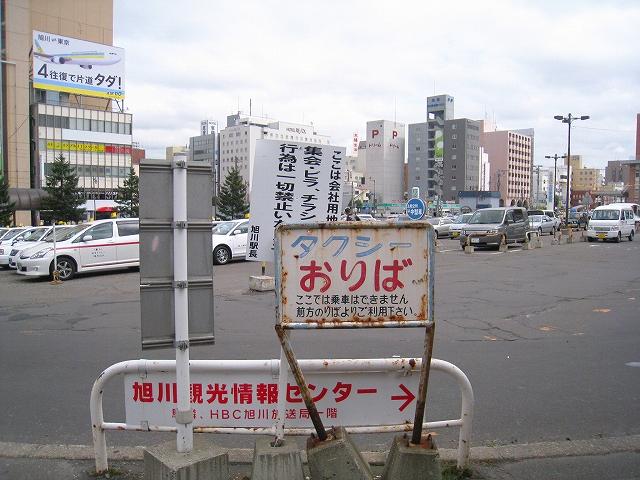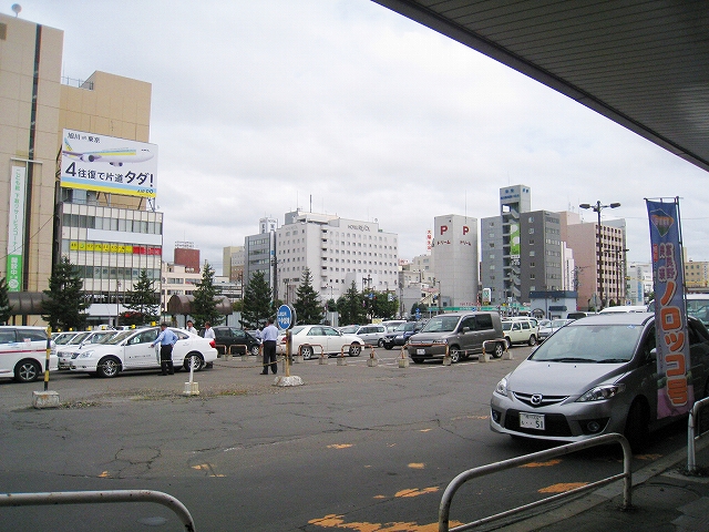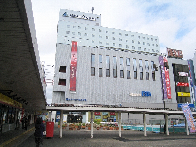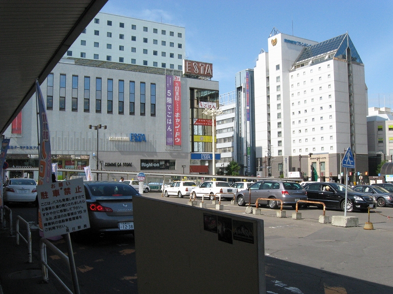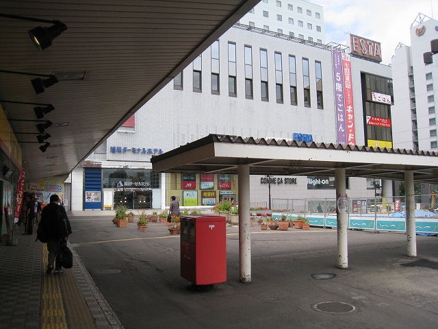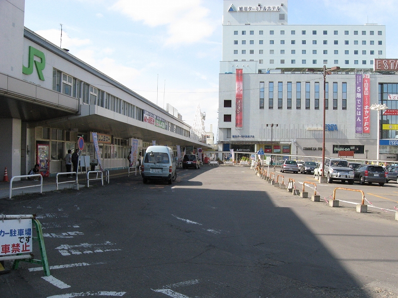 90年代風の「シティ」な旭川ターミナルホテルの入口から父さんを先頭にした家族連れが出てくるのを横目に外に出ると、私は一瞬言葉を失う。「こ、これは…」 富山駅そっくりではないか! あのエスタ沿いの谷の階段と暖色系の煉瓦を詰めた感じ…。そこから見える街並みもなんとなし似ていて、正直、ぜんぜん旭川に来た感じがせず一人でずっと苦笑い。たぶん設計が同じなのだろう。しかしロータリーは昔の柵が立ち並び(昔そこにはタクシーの運ちゃんが腰かけて煙草を吸っていたような…)、舗装も古くて、やはり私はかつての民衆駅のことを思い出していた。こんなところは車やバスが危ないし、怖い人がいそうだと、幼心にろくに見もせず、足早に駅前を去ったものだ。そのときのそのまま、いま、そこにあった。