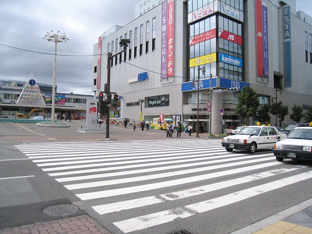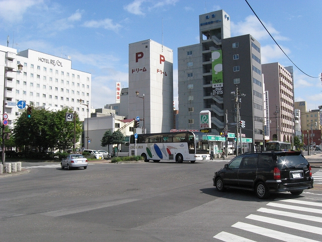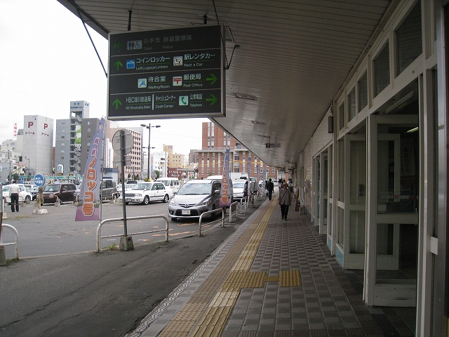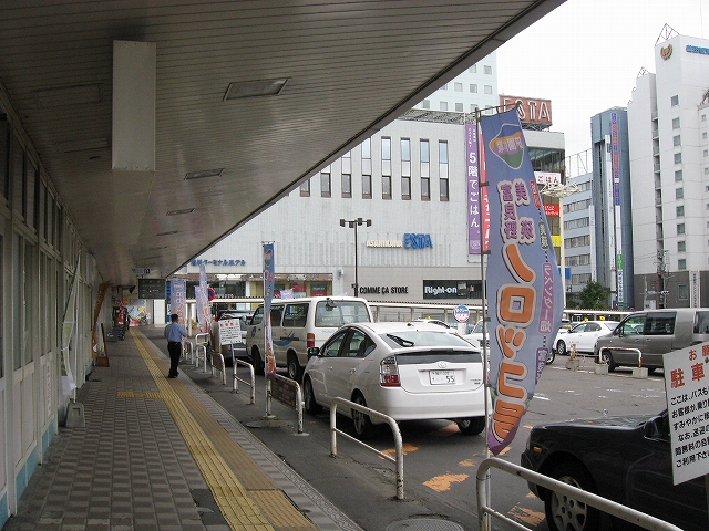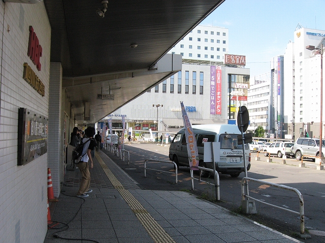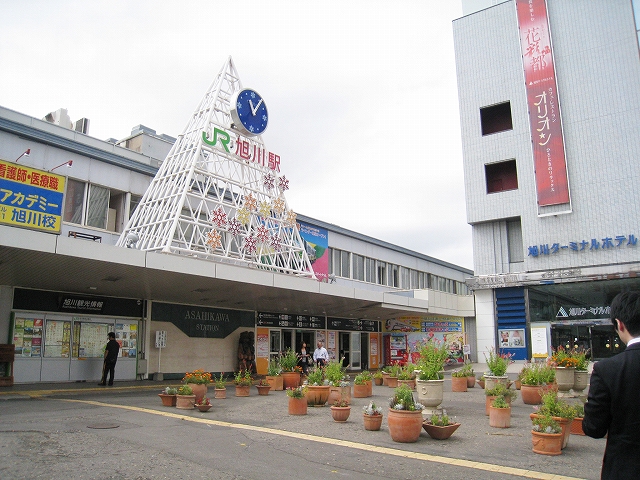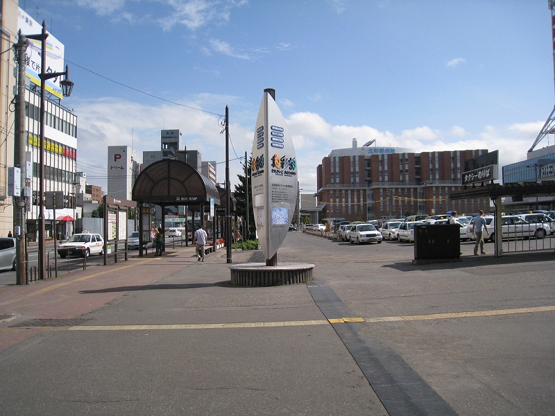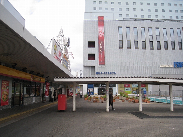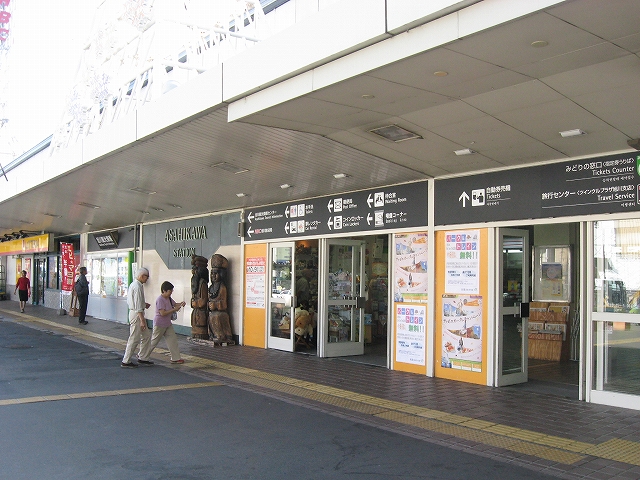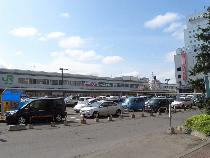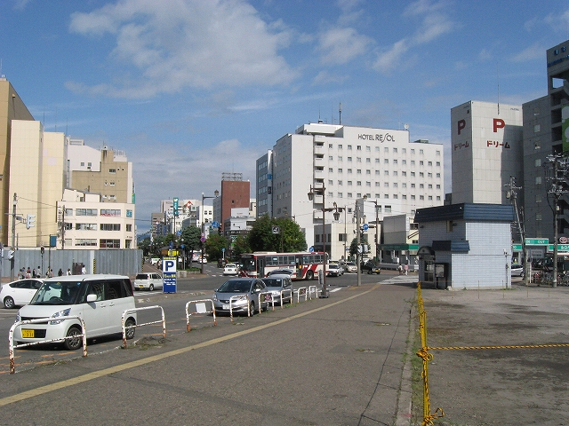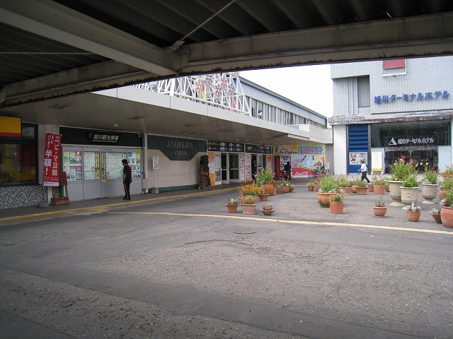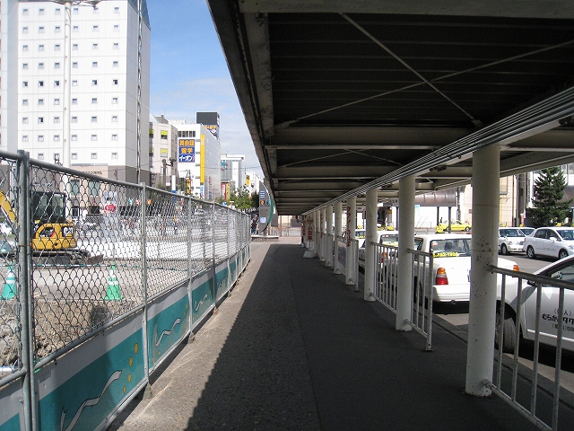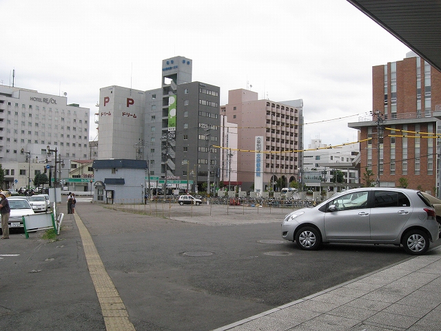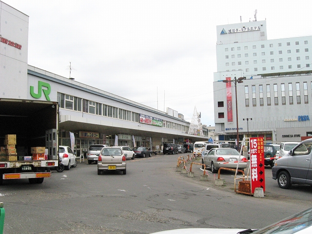 90年代風の「シティ」な旭川ターミナルホテルの入口から父さんを先頭にした家族連れが出てくるのを横目に外に出ると、私は一瞬言葉を失う。「こ、これは…」 富山駅そっくりではないか! あのエスタ沿いの谷の階段と暖色系の煉瓦を詰めた感じ…。そこから見える街並みもなんとなし似ていて、正直、ぜんぜん旭川に来た感じがせず一人でずっと苦笑い。たぶん設計が同じなのだろう。しかしロータリーは昔の柵が立ち並び(昔そこにはタクシーの運ちゃんが腰かけて煙草を吸っていたような…)、舗装も古くて、やはり私はかつての民衆駅のことを思い出していた。こんなところは車やバスが危ないし、怖い人がいそうだと、幼心にろくに見もせず、足早に駅前を去ったものだ。そのときのそのまま、いま、そこにあった。