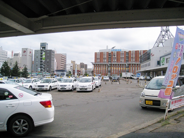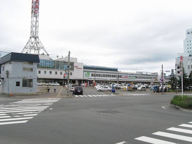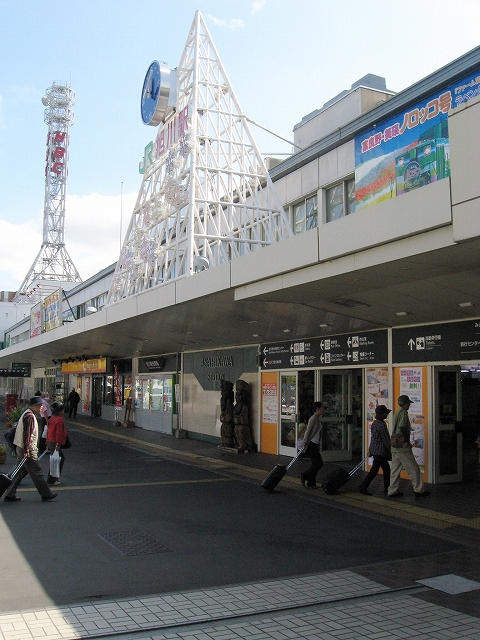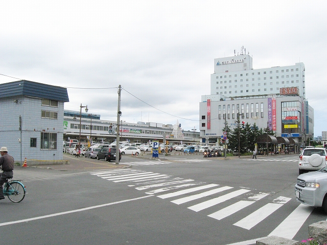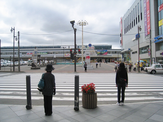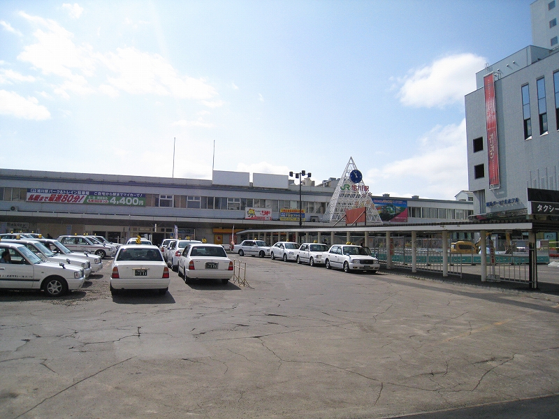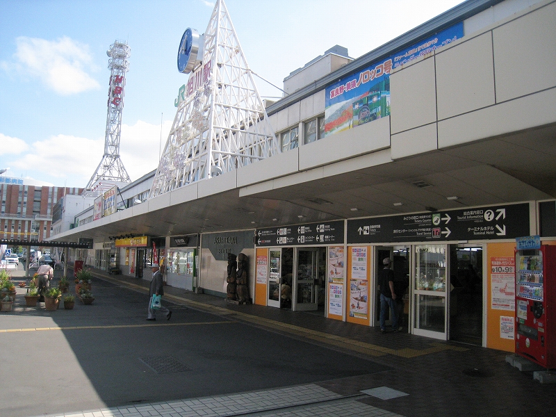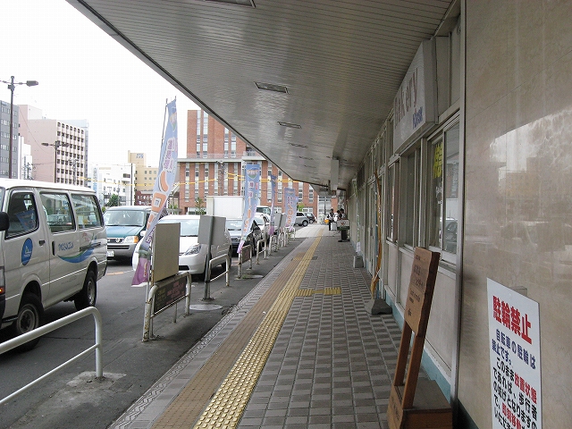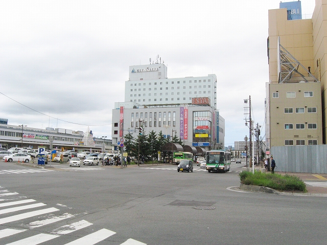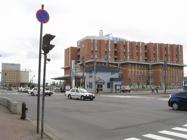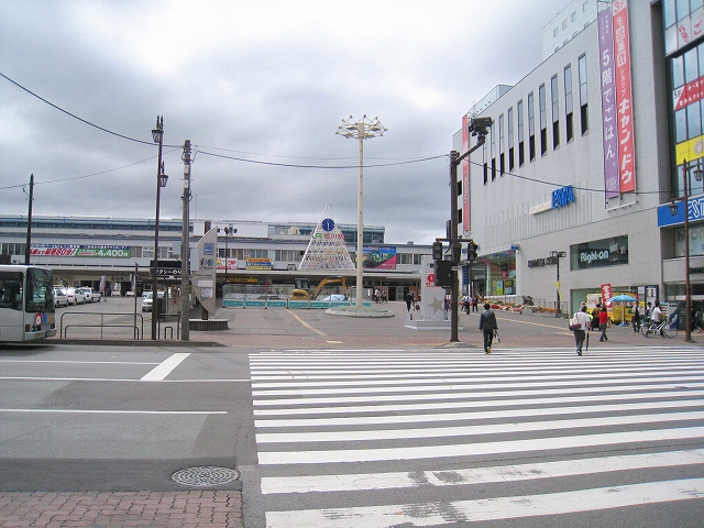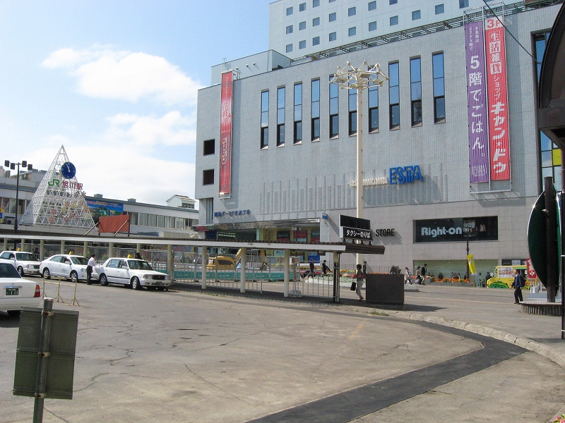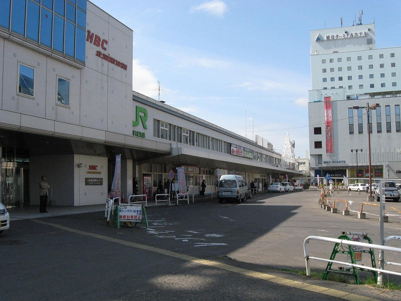 90年代風の「シティ」な旭川ターミナルホテルの入口から父さんを先頭にした家族連れが出てくるのを横目に外に出ると、私は一瞬言葉を失う。「こ、これは…」 富山駅そっくりではないか! あのエスタ沿いの谷の階段と暖色系の煉瓦を詰めた感じ…。そこから見える街並みもなんとなし似ていて、正直、ぜんぜん旭川に来た感じがせず一人でずっと苦笑い。たぶん設計が同じなのだろう。しかしロータリーは昔の柵が立ち並び(昔そこにはタクシーの運ちゃんが腰かけて煙草を吸っていたような…)、舗装も古くて、やはり私はかつての民衆駅のことを思い出していた。こんなところは車やバスが危ないし、怖い人がいそうだと、幼心にろくに見もせず、足早に駅前を去ったものだ。そのときのそのまま、いま、そこにあった。