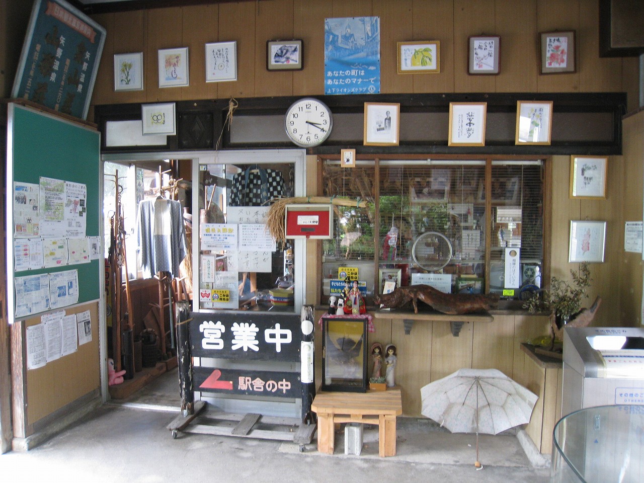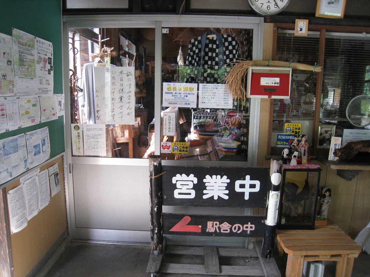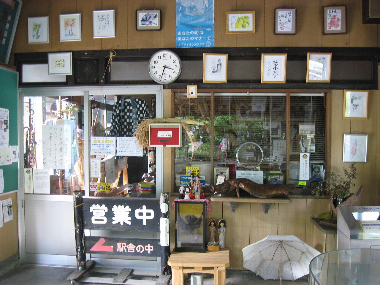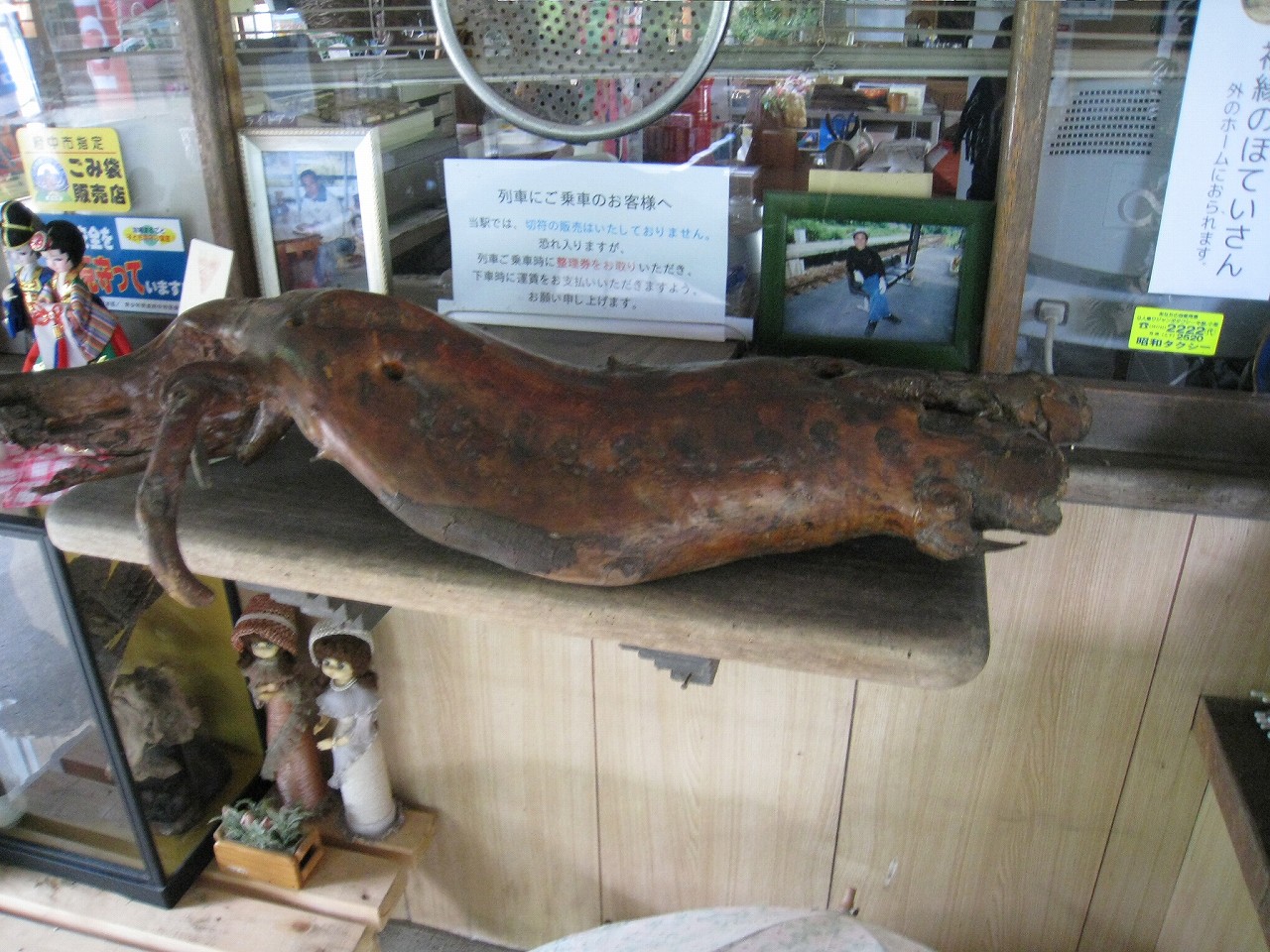 駅舎内は民芸品と額縁の嵐で、随分とおもしろい駅に来たなと。やはりこういう駅もないと駅旅は楽しくない。人形、彫刻、書籍、そして壁一面の手書きの詩画…お店の方はこのとき残念ながら臨時休業だった。もともとここでは20分くらいしか時間がなく、食べるのは無理だっただろう。車で来て、少し列車に乗るのもいいかもしれない。にしても、豚の丸焼きかラッコかわからない滑らかな自然木を見て、ほんと趣味全開で、気楽で親しみやすさを覚えた。きっと店主もおもしろい人なのだろう。