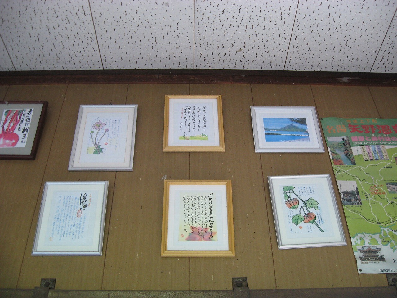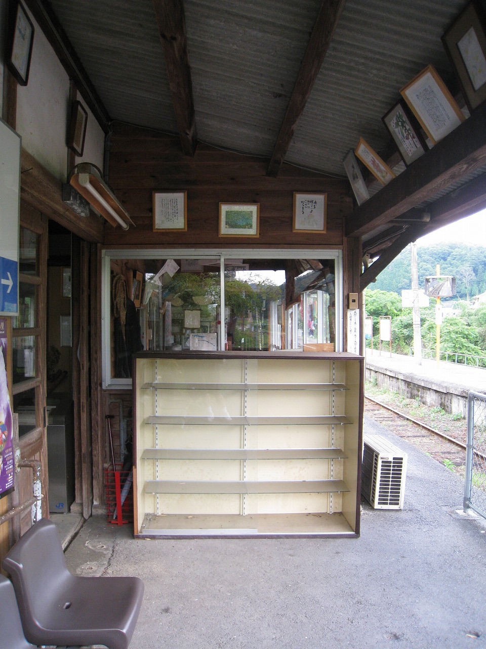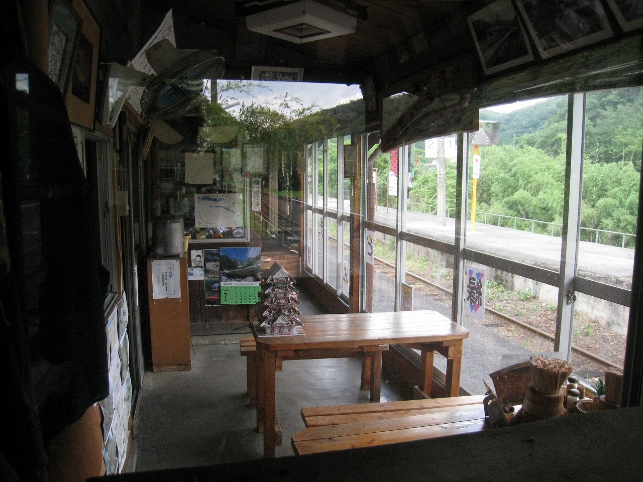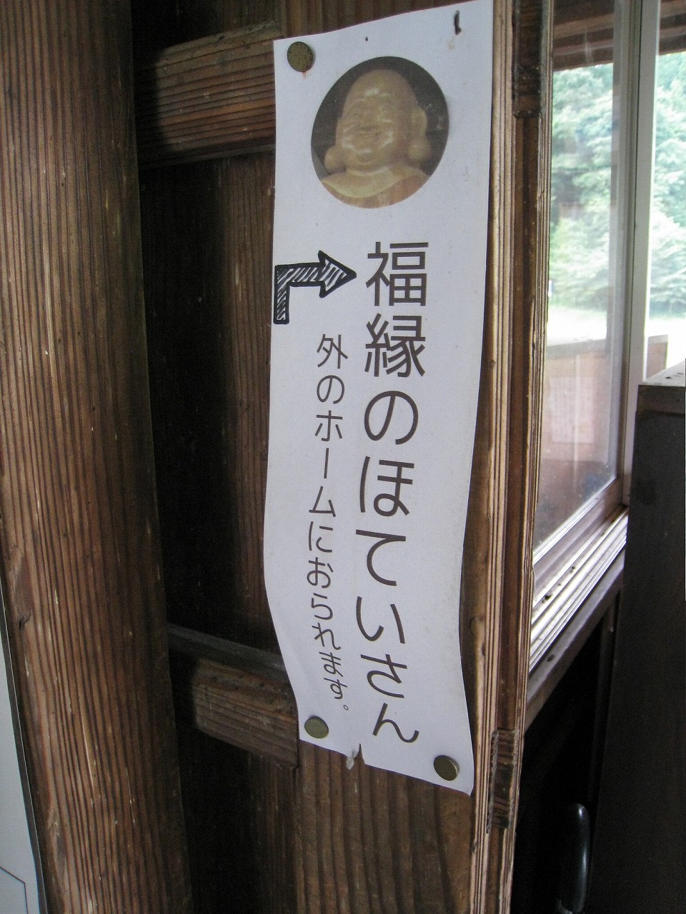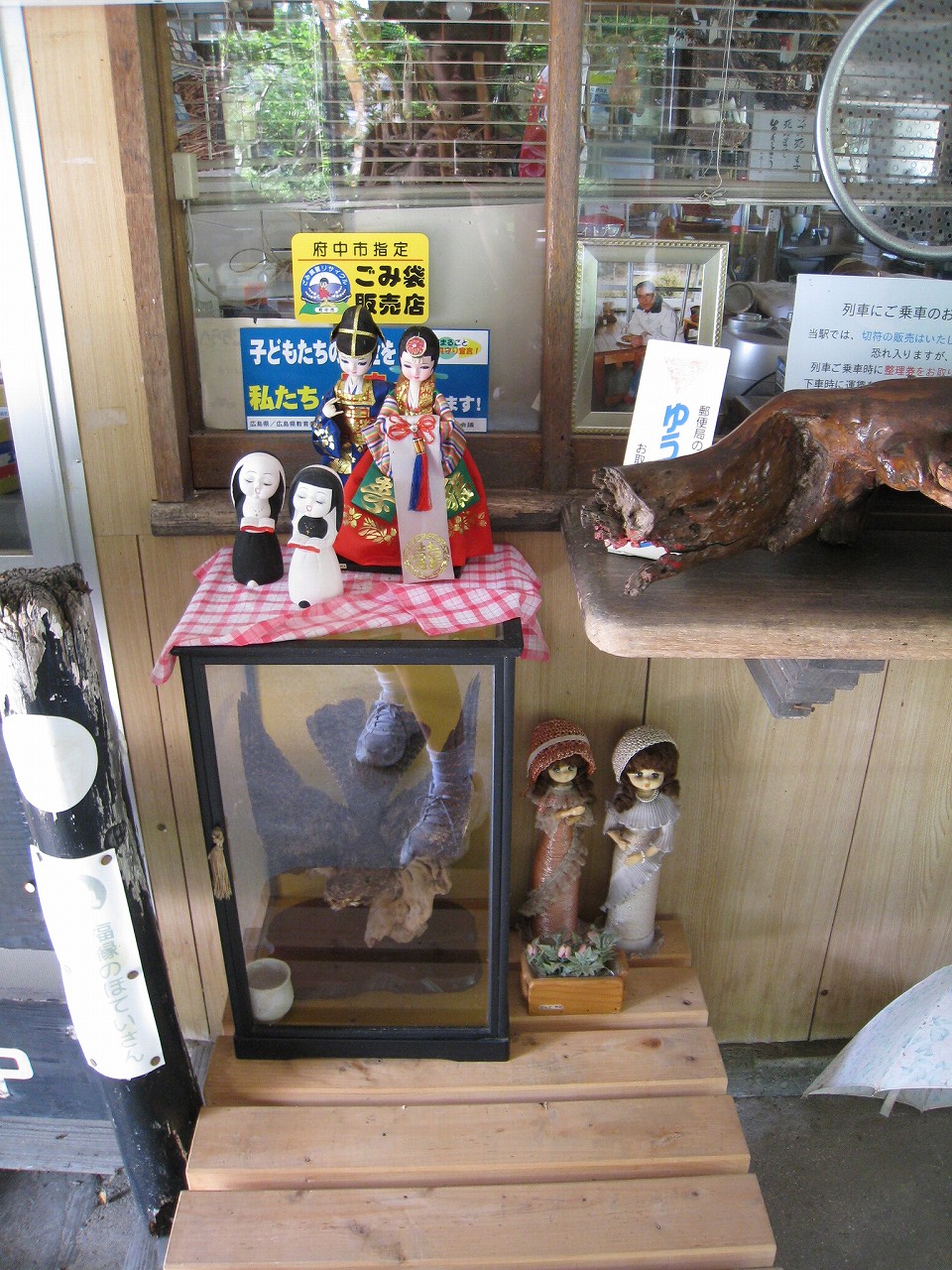 駅舎内は民芸品と額縁の嵐で、随分とおもしろい駅に来たなと。やはりこういう駅もないと駅旅は楽しくない。人形、彫刻、書籍、そして壁一面の手書きの詩画…お店の方はこのとき残念ながら臨時休業だった。もともとここでは20分くらいしか時間がなく、食べるのは無理だっただろう。車で来て、少し列車に乗るのもいいかもしれない。にしても、豚の丸焼きかラッコかわからない滑らかな自然木を見て、ほんと趣味全開で、気楽で親しみやすさを覚えた。きっと店主もおもしろい人なのだろう。