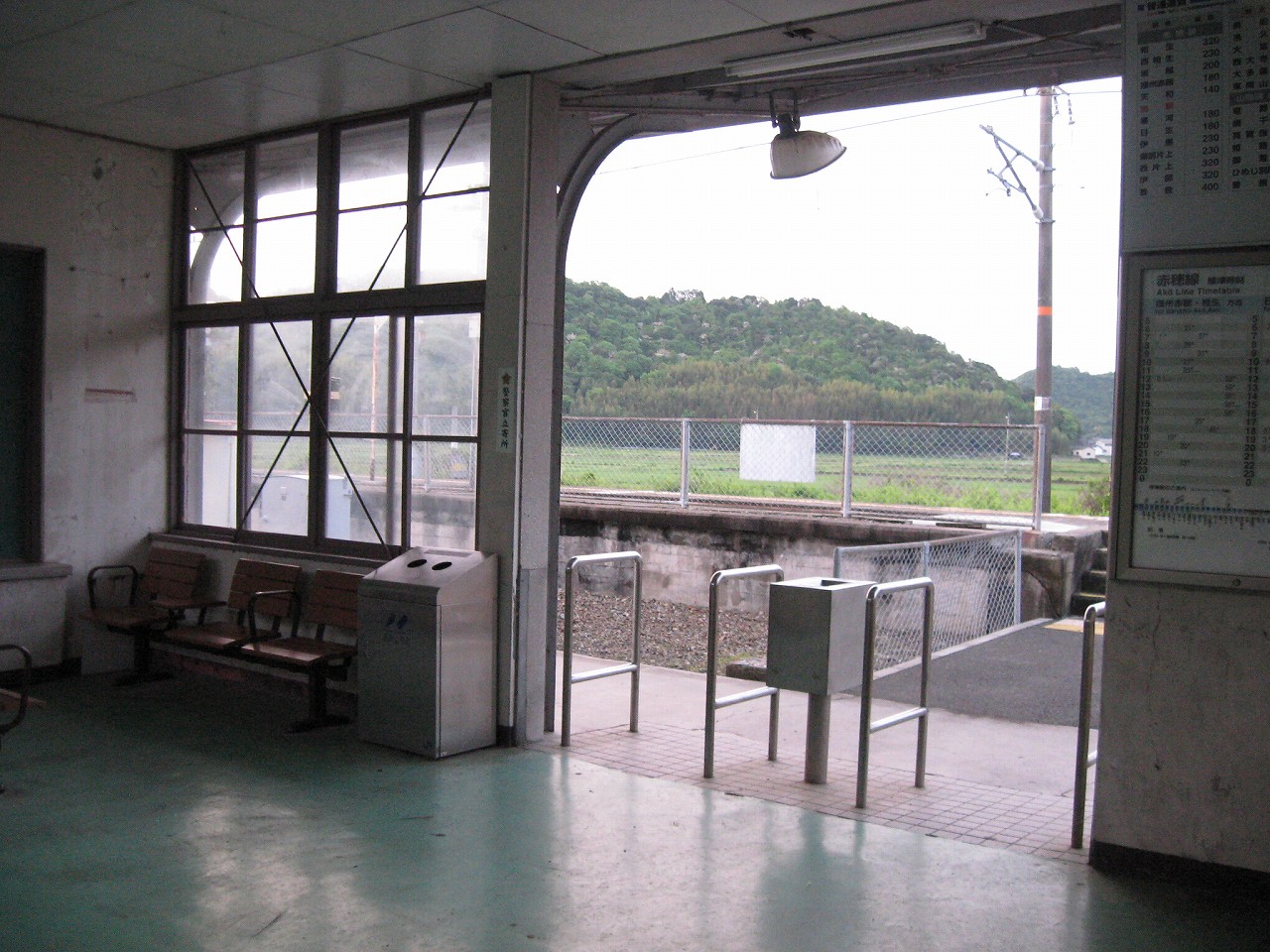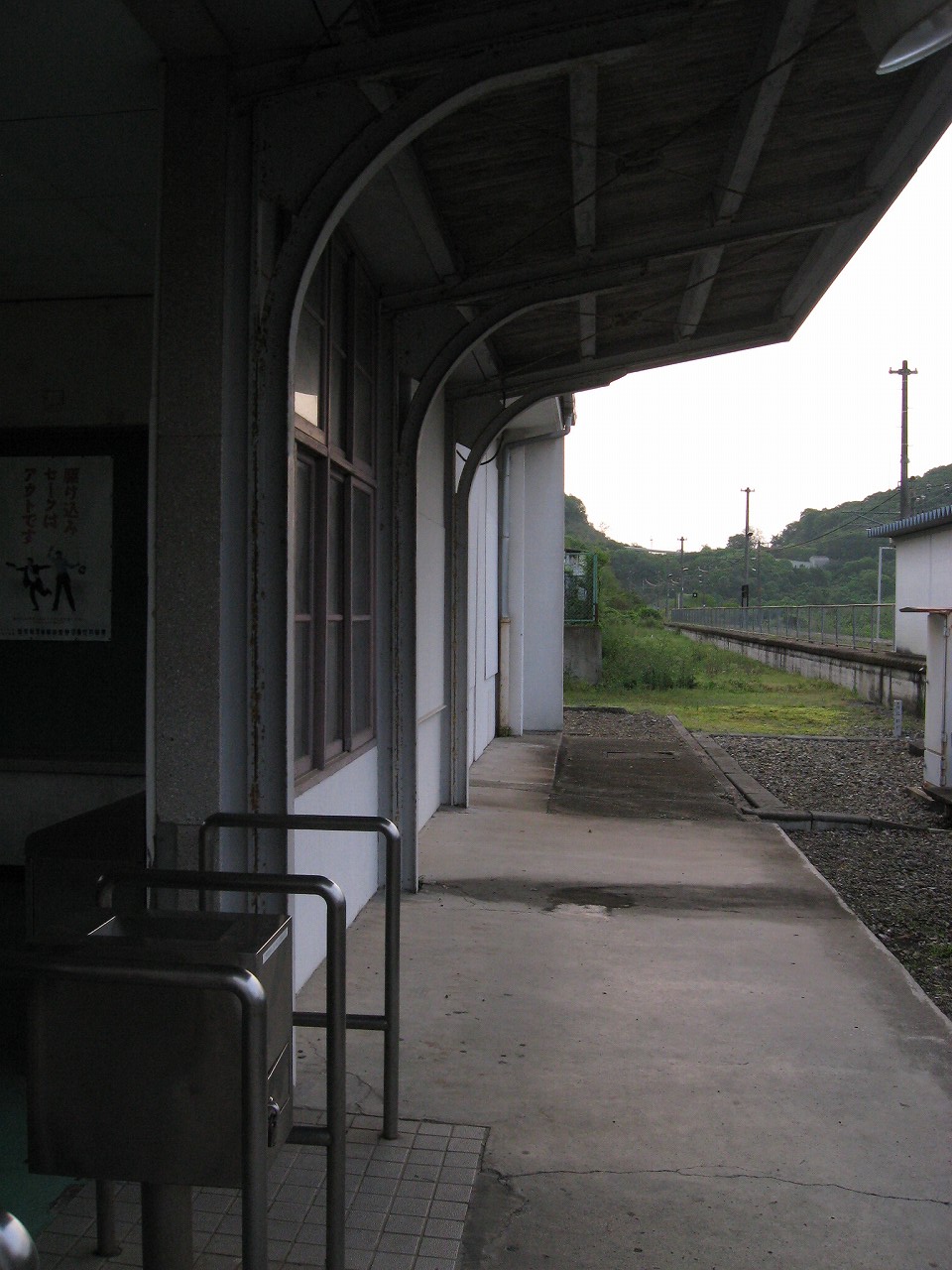 朝4時半ごろ、体を起こした。実はほとんど眠られなかった。この駅舎、どうもなんかいそうな気がして… 真冬に紀伊半島に行ったとき、南国なはずなのに脱いでおいた靴は氷のように冷たくなっていたが、五月の今は、もうそんなことはなかった。ほんのりと靴下や靴が冷たいぐらいだ。