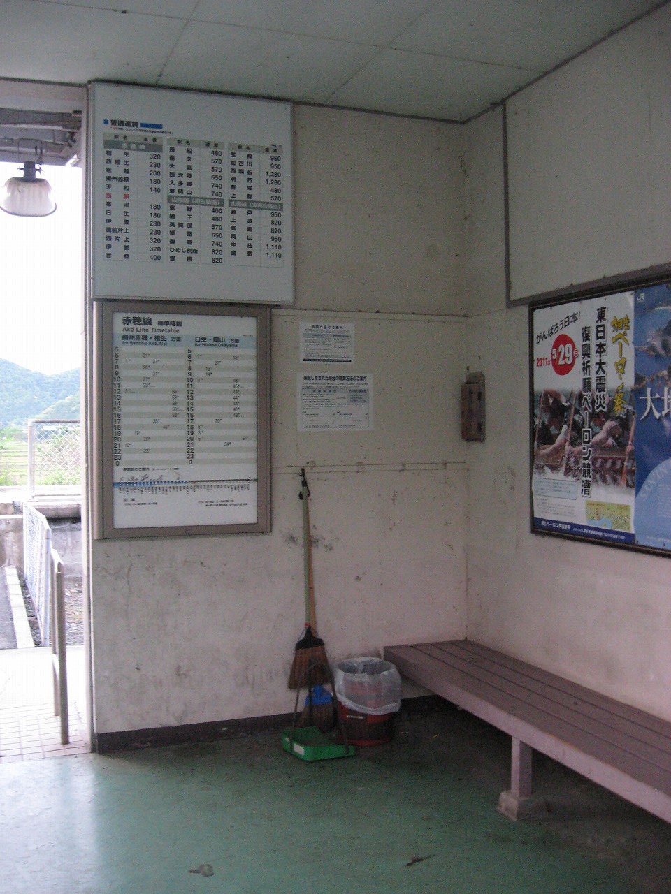 途中、荒れた空き地にプレハブを置いたお好み焼き屋があった。この辺はカキオコが有名なので、それかもしれない。本場は隣りの寒河である。あんなふうな自由な仕事もいいなとも思う。もっとも、あえて赤字を出す副業かもしれないけど…それはともかく、僕もどちらかというと外構などまったく気にしない方だ。自分の部屋をきれいに直し、物をそろえて暮らしていくので精一杯である。日本の中であっても生き方なんてなんぼでもある、旅を通して見てきたいろんな風景が、僕の心の教科書でもある。それにこうして、ほら、僕がこうして休憩して座っている椅子のある駅舎も、どこもかしこも虫などで薄汚れて、ボロボロである。けれど箒があって、誰かが掃き清めているようだ。やれるようにやるしかない。それは家のない者が、今着ている服を一生懸命整えているようなものかもしれない。たぶんみんなそうして生きている。一部の目の飛び出すような富裕層を除いては…