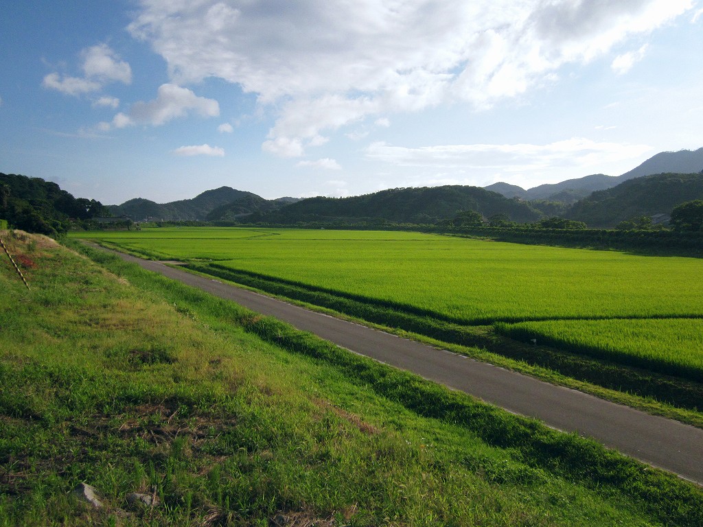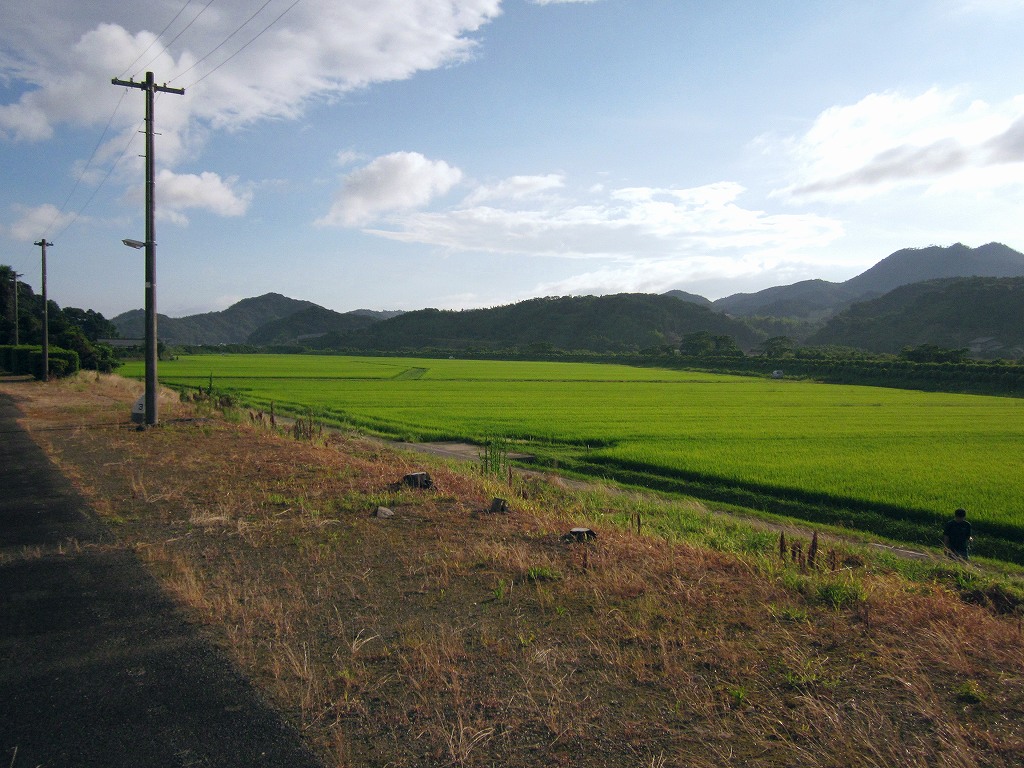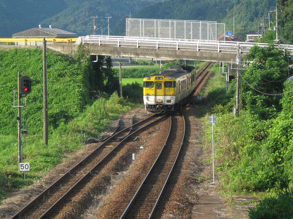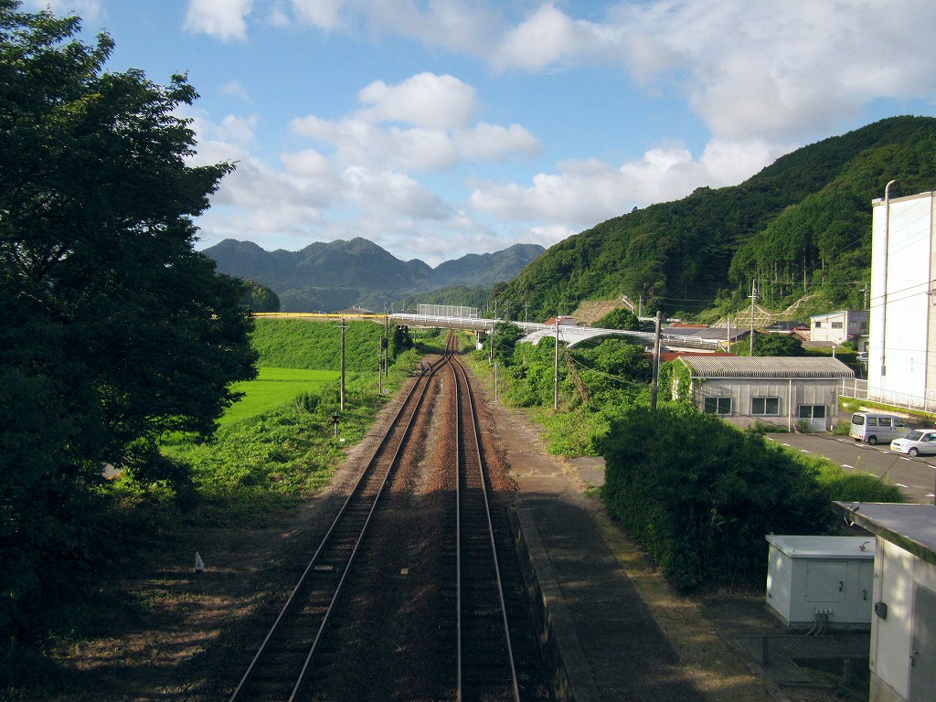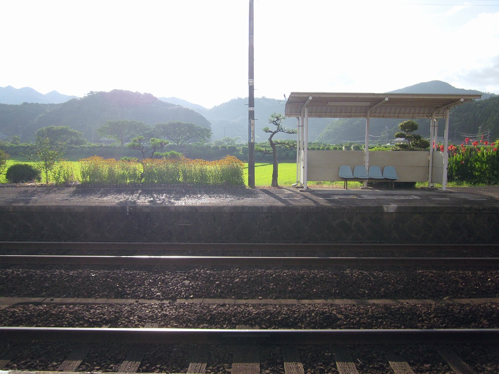 相変わらず曇っている。なんだか躰がお休みモードになりそうだ、と、ロングのモケットにだらりと背をもたせ掛けて冷房に涼んでいると、列車は内陸の方に入ってしまって、そこで私は旭光の太刀を浴びせられた。