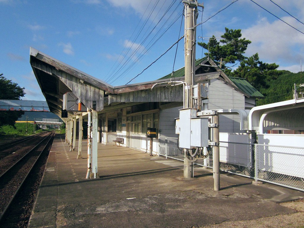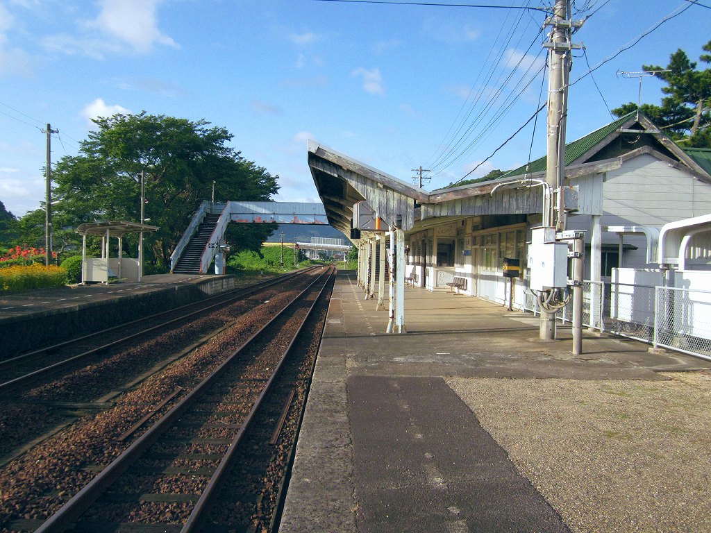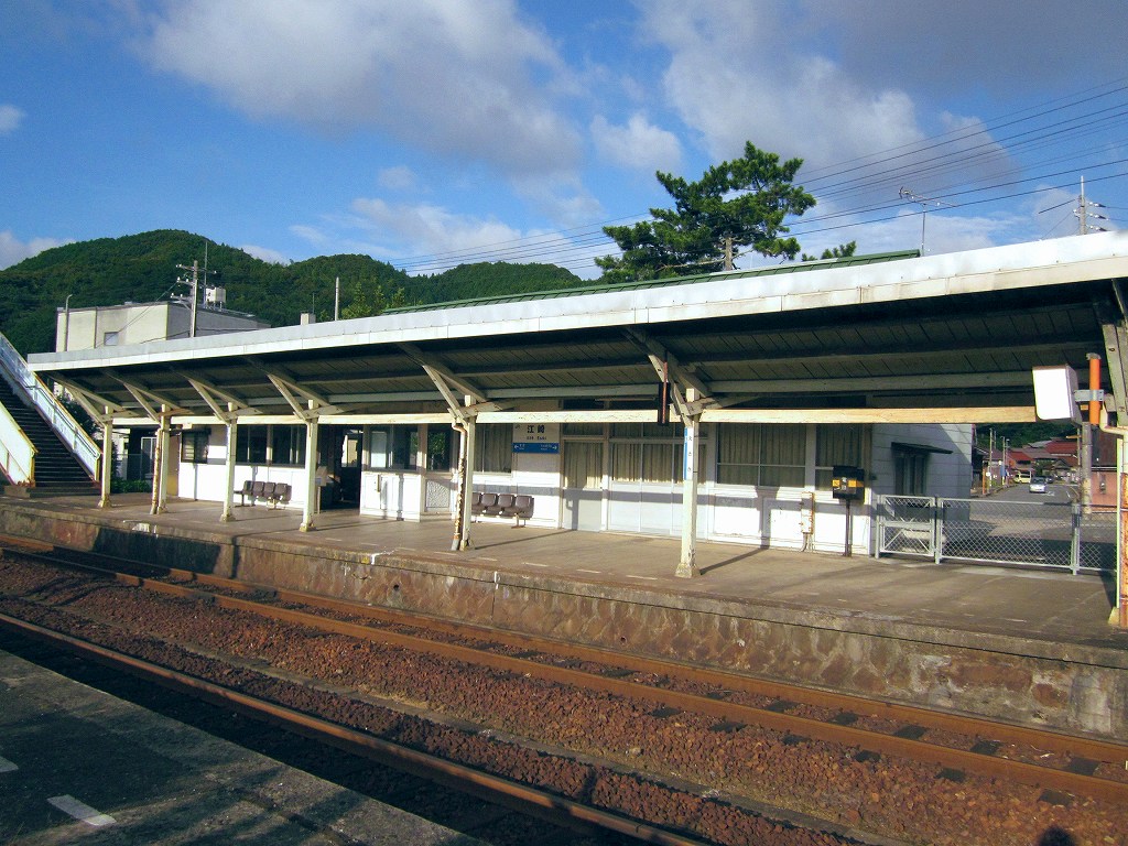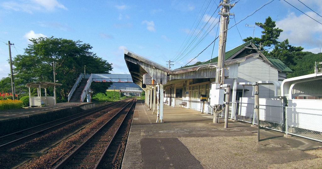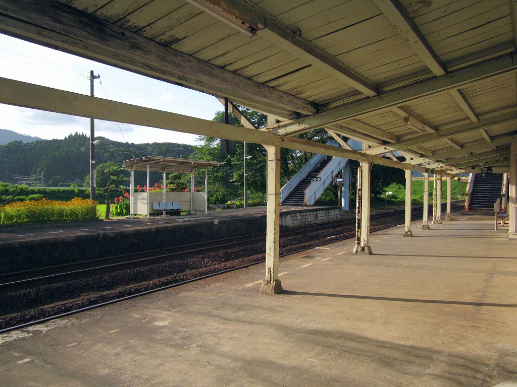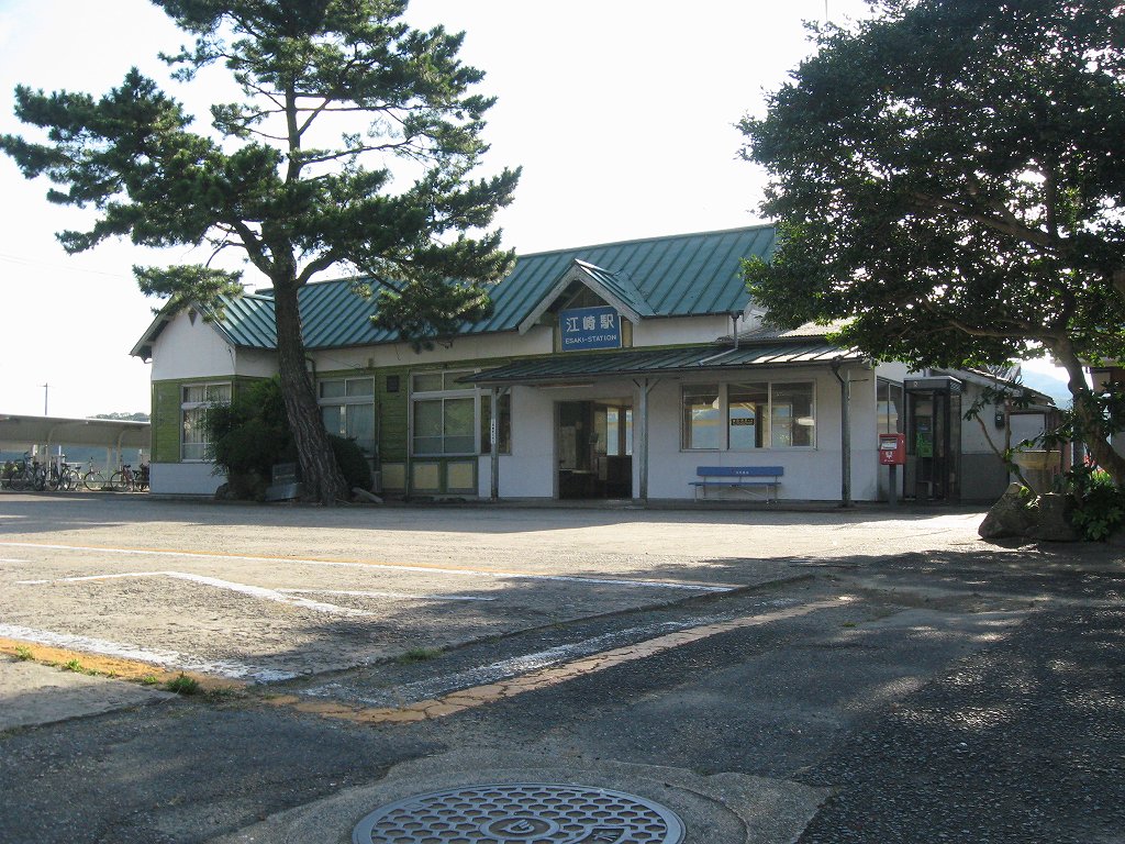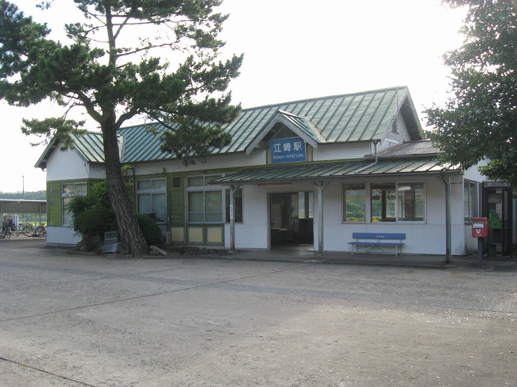 もうぼろぼろの看板を掲げた中華そばの店や、海の本町に出るまでの山道に臙脂の甍がつづいていることからすると、町の集約化の前はここもほかと同様、そこそこ人々がやって来るところのようだった。きっとあの右手の乗合馬車を飛ばしたに違いない。朝鮮人帰還の碑もある。ずっとさきの江崎は天然の良港だ。駅舎も洋風の三角で、トタンなんて戴いている。こうして駅の建物の正面を向いていると、今にも海風にまみえそうな、松籟響いてきそうな、そんな雰囲気で溢れていた。けれど私以外、もう誰もいない。