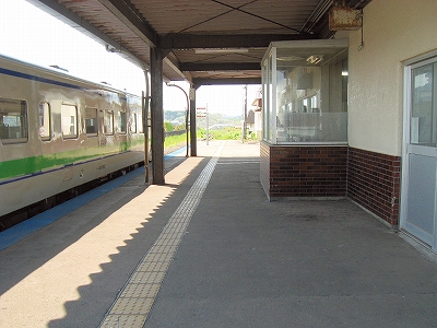 埃や虫の巣窟になった耐寒玄関をくぐって、待合室は生きている証だなと思いつつ中を進むと、改札の戸が引かれていて、気動車のガラガラいう音ががらんの待合室に響いていた。駅員らしきが戸の脇に立っている。発車までまだ時間あるかなと思い、横の時刻表の前に立って探すともう少し後だった。すると係りが、乗車されますか? 切符はもう?
