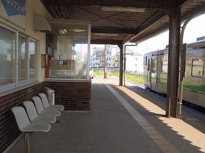 暑さを抜かれたこの燦然たる光耀からいっきに日陰に入るのが駅舎の中だった。そして風がよけられることの意味を実感させる。沈痛な静謐。ほんのりと暗いが、それは暗順応のためだとやがてわかって、実はごく標準の明るさだった。全体が待合部であり、終端駅の容量を見せつけている。古いタイルを使っているものの、ワレもカケも室内はきれいだった。もちろん有人駅で、現役の宿直室も設けられている広い駅務室は、受付窓口に似た出札口を備えて、透明板の向こうでは暖房に身を包まれつつ駅員が座したり立ったり、しずかなところでのんびり事務をしているようだった。現金授受の小さな手元口が厚紙で塞がれている。何か、とそっと近づくと、「風よけです」。ホームへの引き戸を開けると風が入り、その狭い手元口から入って強い隙間風になって、紙片を飛ばしてしまうのだろう。どうしてそっと近寄ったかというと、あからさまにすると、客だと思って駅員が急いで窓口の椅子に座ってくれるのだ。こういう駅はけっこうある。
