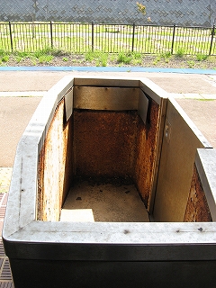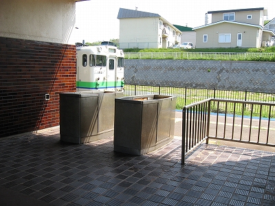風強いだろうなと思いつつ外への戸を押すと、なぜか無風。そう、いったん大きなガラスをはめたポーチに出る 北国の二重玄関だった。今でもむんとしているが、夏は熱気がたいそう籠りそうだ。それからいよいよ外へ。辺境の転回場に人模様はなく、隅の方は土のままで、大八車や古タイヤがほったらかしだった。