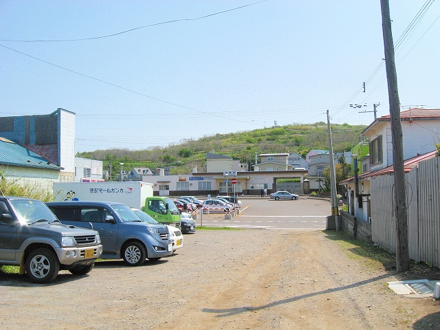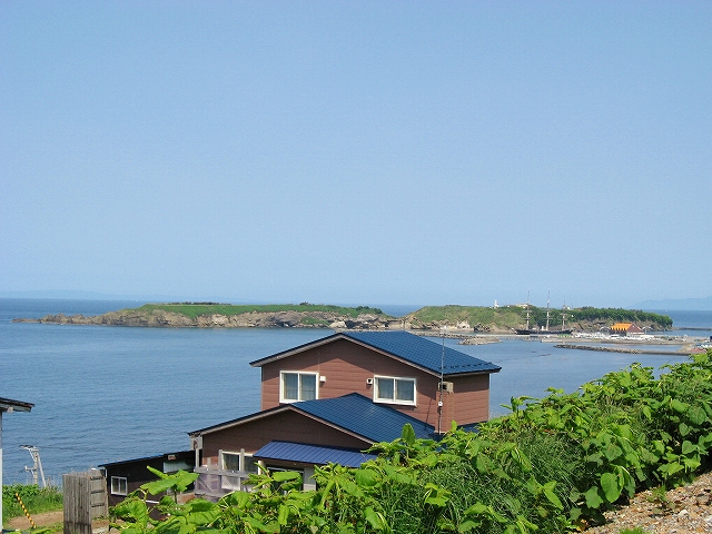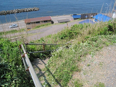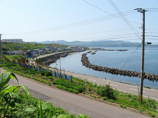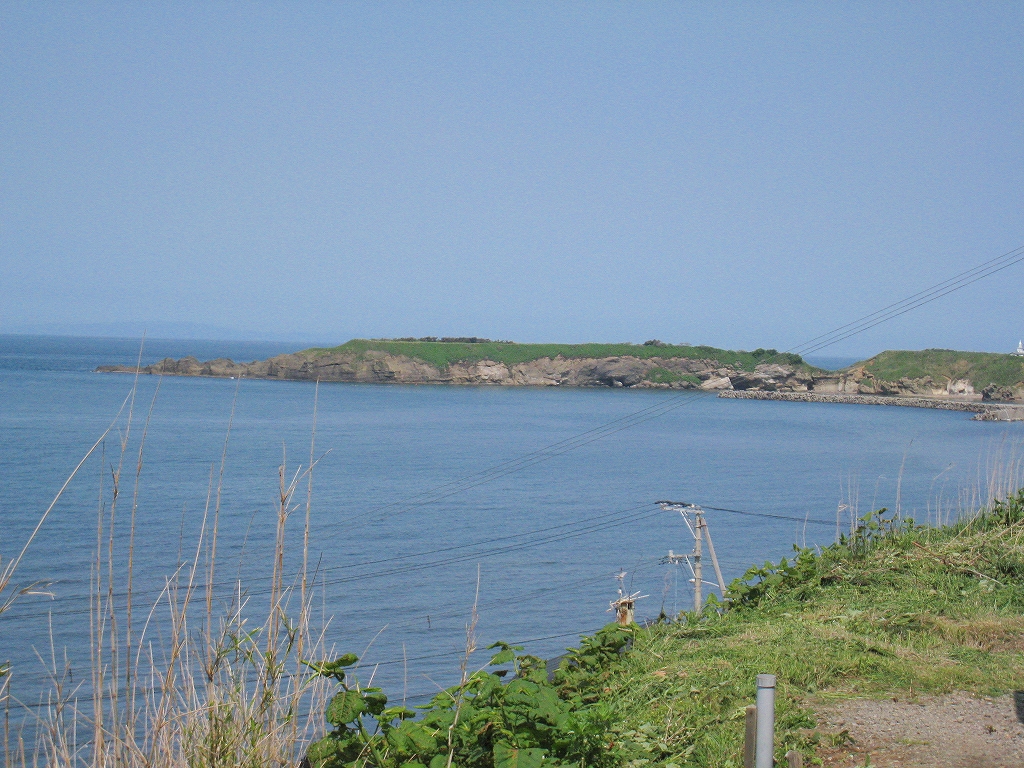振り返ったら急斜面に無理やり階段を刻んだようで、どこかにスイッチバックの道路があるのだろう。それに下りぬ方が景色は良かった。海岸国道にはまだ少し降りないといけないが、海辺はただの護岸だ。それよか、さっきから見えていた、北方にある岸に近い二つの不思議に平らな島に行ってみたいものだ。結構近くて、岩場の表情などもわからなくはない。後で調べると、ちょうとあの辺が江差港で、江差の街なのだった。