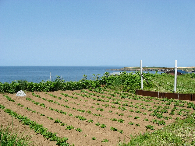 木板で囲った海を望むささやかな畑。
