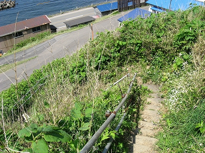 道はそっから急に人一人分あるかないくらいになって、狭苦しい石段の急降、横からどっさり伸びてきている草を鞄でよけ、あまり使われていないのかと思うも海辺の明るさに助けられて下りてくが、途中、傾いた石段に水が湧いていて苔が育っていて、絵に描いたような転び場だ。絶対これ滑るだろう、と本気で引き返そうとしたが、足の裏に力の変化がないようにそこを踏み、下りていった。