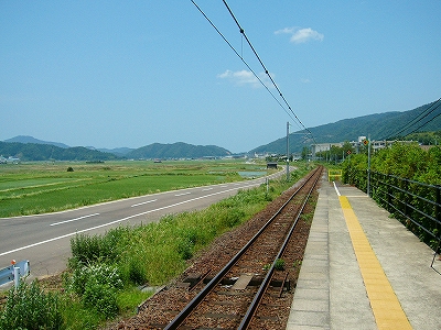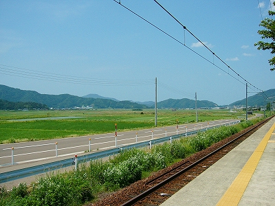 そうしてこの駅に降りて、ほどなくすると困惑したものだ。風景は目を瞠ったものの、夏に下駄を履かされている可能性もあって、またもや何でもないものを尊んで冷笑されているのではないかと思えたし、それ以外のに目を留めると、コイン精米機と田んぼと山と、田舎家しかなく、あとはひたすら日射が顔を灼いていくばかりなのだ。眩しくてものを見るのにも手で庇を作らないといけない。さいわい、数十分後に小浜方面が来るのでいいものの、そうでもなければ暇すぎて暑すぎて頭がどうにかなりそうだった、飲み物も買えないし、横にもなれないし。残念ながら、そんなことばかりを考えざるを得ない。何かあるはずだと言い聞かせてみても、足が疲れを感じはじめたのか、歩く気も起きず。妙なところで降りてしまったもんだ、と思うも、「そうだこれを休憩の時間にしよう」と、待合室に籠って、足を休めた。もともと十村から歩いて来ようと思っていたのだが、ちょうど電車があったので乗って来たのだった。だからさっきの十村からは歩けない距離ではない。似たような風景なのに決まっている。