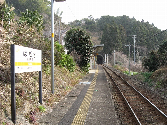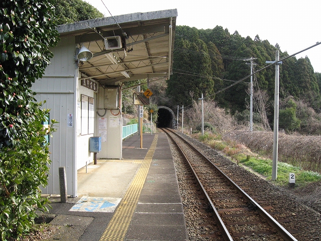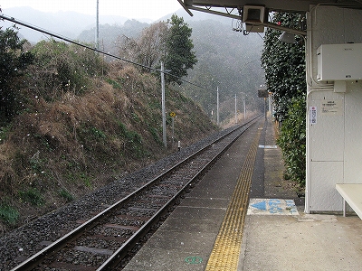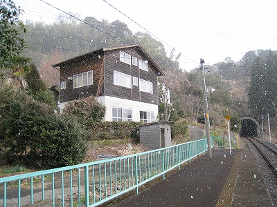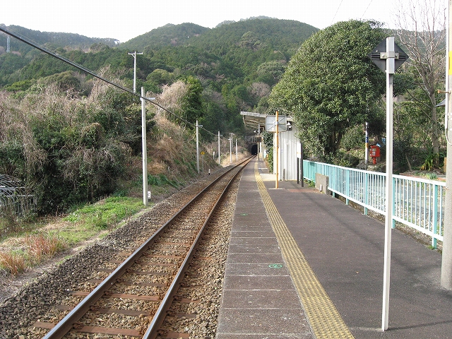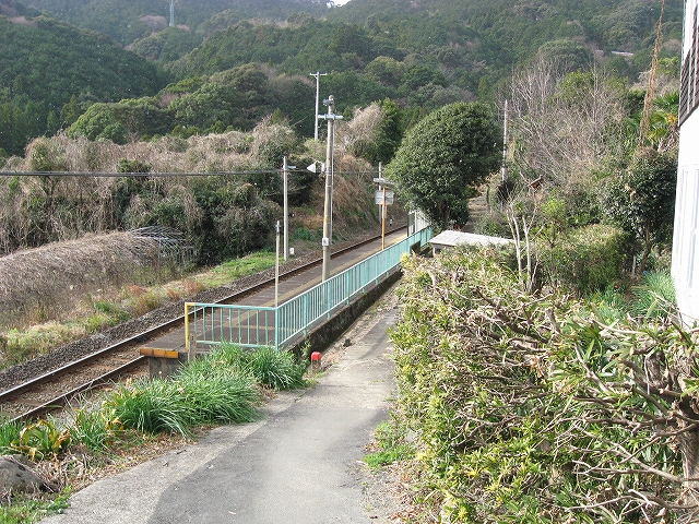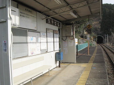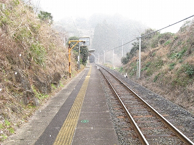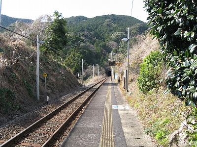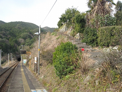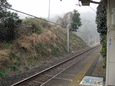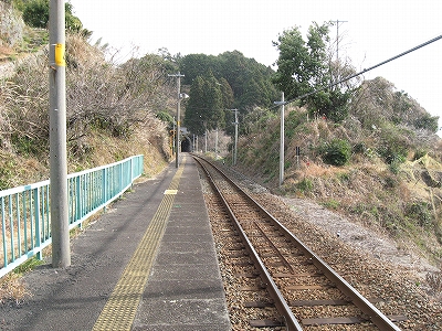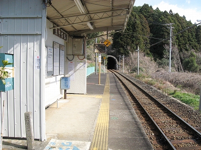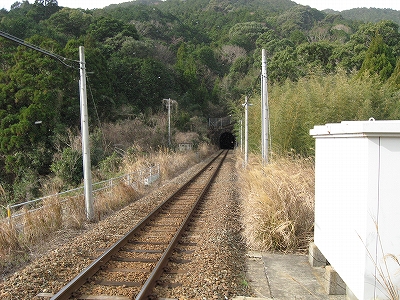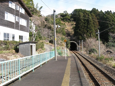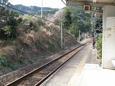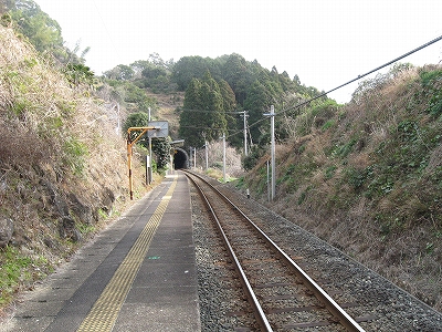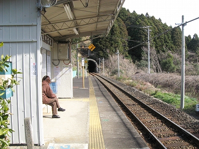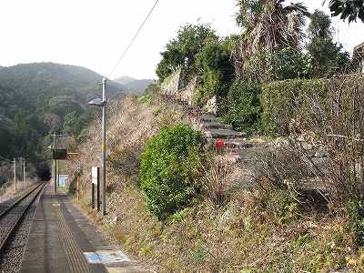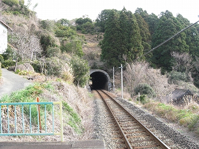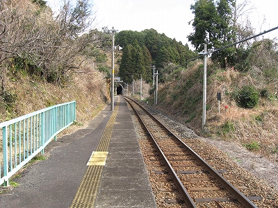 こんな淋しいところにも人の住まうらしく、山手の側にこそ数軒あるのがわかる。駅の出入り口もいうまでもなく、そちら側だ。もっともこんなところにもなると、すぐトンネルが見えているように、隣の集落に移動するには、そのトンネルを汽車のない時間に伝う方が絶対早いというように、さきほどの丘尾根の里道から直背ホームに上がるというような自在な使い方も、ここの畑仕事の人にはふつうであるようらしいところだった。