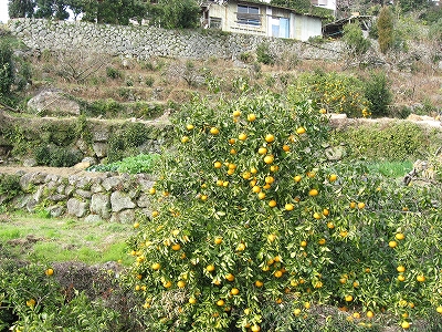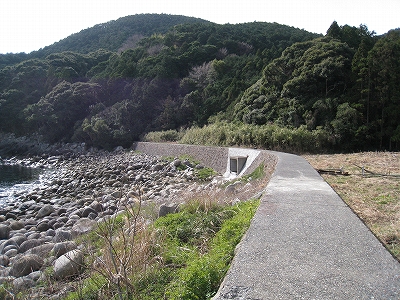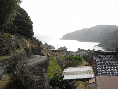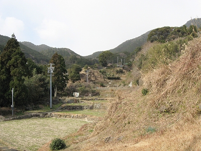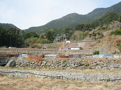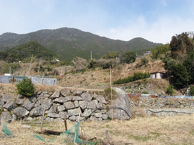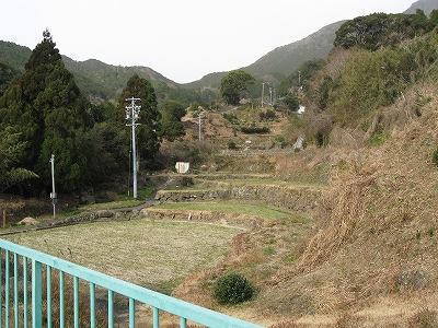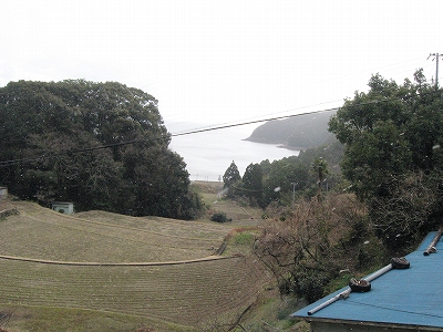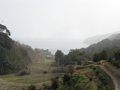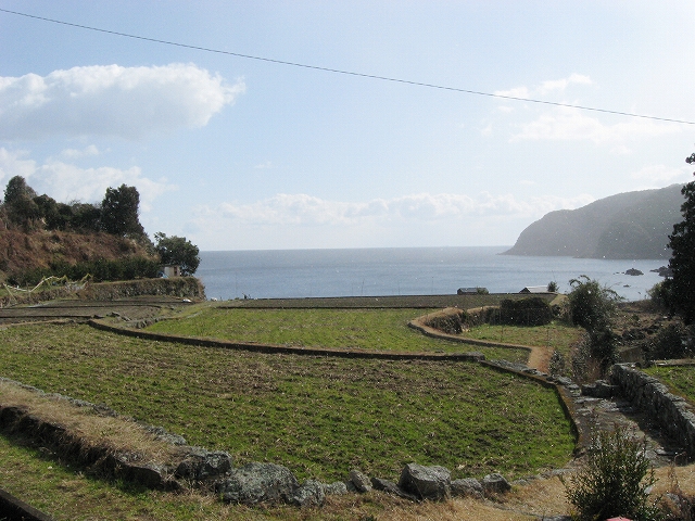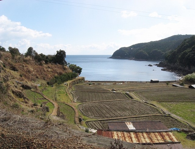 私は堤防より先には進めずにいる。規定されていない土地とは、不安なものだ。漁師たちがしきりに岩場に名前を付けたのも、利便のためだけなく岩への意識もあったのだろう。不安なって振り返ると、見事というべき棚田が続いていた。不思議なことに、その土坡は鋭く割られた隙間のある大石の堡塁で作られ、海岸のものではなかった。こんなところにいかにも苦労した感じで棚田を作ったのはなぜだろうか、と目を丸くする。今の考えでは、もっと平地に行けばと思うが、かつてそのようなところは早くから豪族が支配していたのだろう。これらの石垣が具体的にいつ作られたかはわからないこともあるそうだ。私はその鋭い割れ方を見て、ちょっと東紀州っぽいなと思う。賀田の殺伐とした港や、集落のコンクリートの道が急峻なのを思い返していた。JR東海の支配する中部地方のようでもある。ともかく、この地でやらねばならぬという状況があったのだろう。するとよりよい地を求めつづけるのでなく、今ある与えられた土地で、なんとかやっていくことも大切なのだなと冷たい風の中しみじみ思わされた。誰も知らないようなところだが、私は密かに心打たれた。その石垣は、海まで出ないと見えなかった。