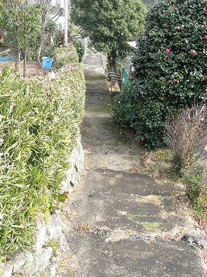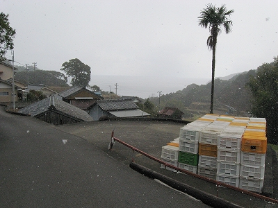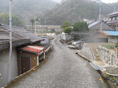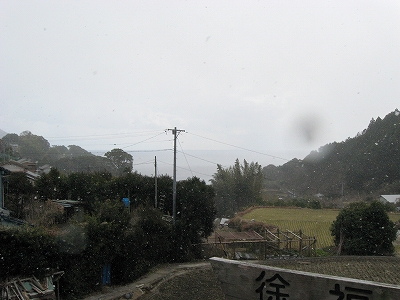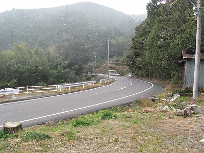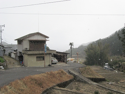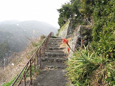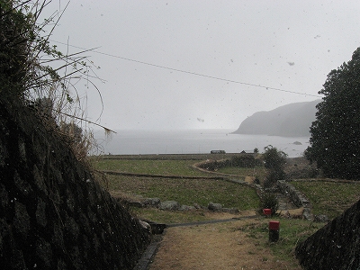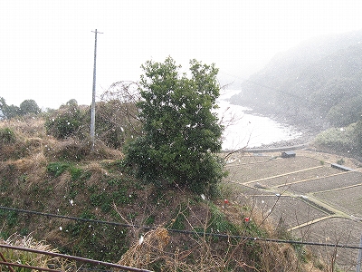 やはり海の方が気になりだし、一気に下って、バリエーションルートを取る。古道は往路よりも寂しく、急に心細くなった。たった独り、南国の驟雪の中だ。気でも違うかもしれなかった。