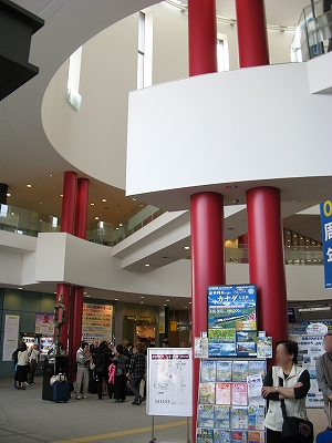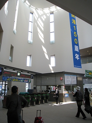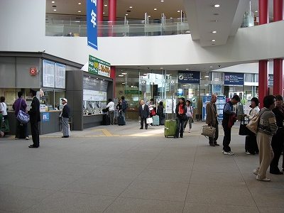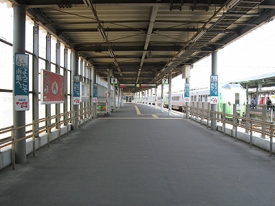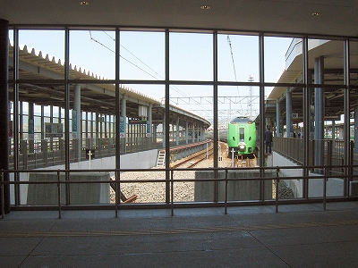 函館駅は日中でありながら、夜の煌びやかさを窺わせている。線路はどうにもこうにも ここで行き止まりの図なので、改札への通路はいくつものレールの終わりをガラス張りの向こうに見せている。だから列車が到着している様子は展示場さながらだ。