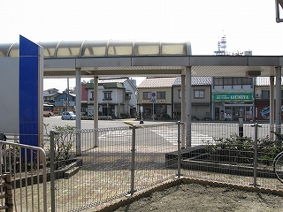 姫塚前から見た駅前の様子。右手の道は、駅前から出る2つある道のうちの1つ。