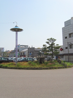 七尾方に見た剣塚と駅前広場。