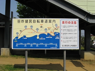 羽咋健民自転車道案内。北陸鉄道能登線の廃線跡を利用したサイクリングロード。ここから、終着駅だった三明(さんみょう)までの25.8kmは廃線跡を利用。そこからは廃線跡ではない7.1kmを経て、福浦の巌門に至るようになっている。